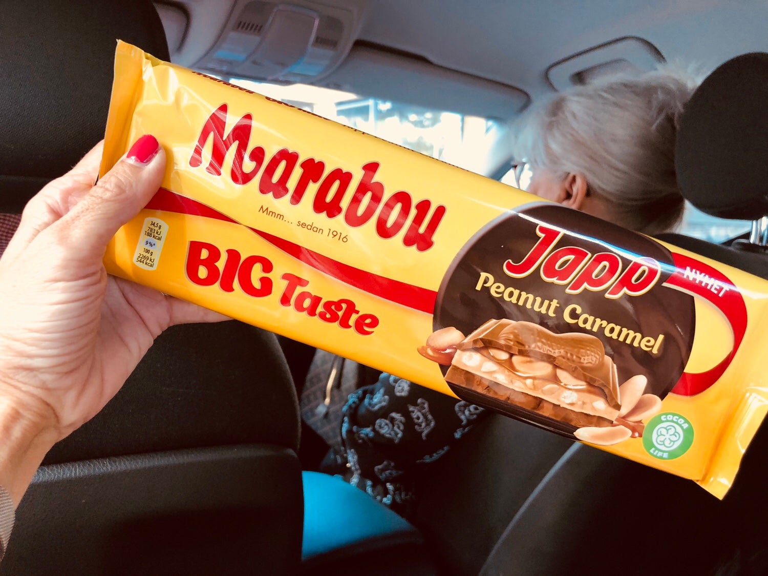 Fredagsgodis i bilen. Passar på när inte jordnötsallergikern (Micke) är med. Varit så sugen på denna! Nån som testat?