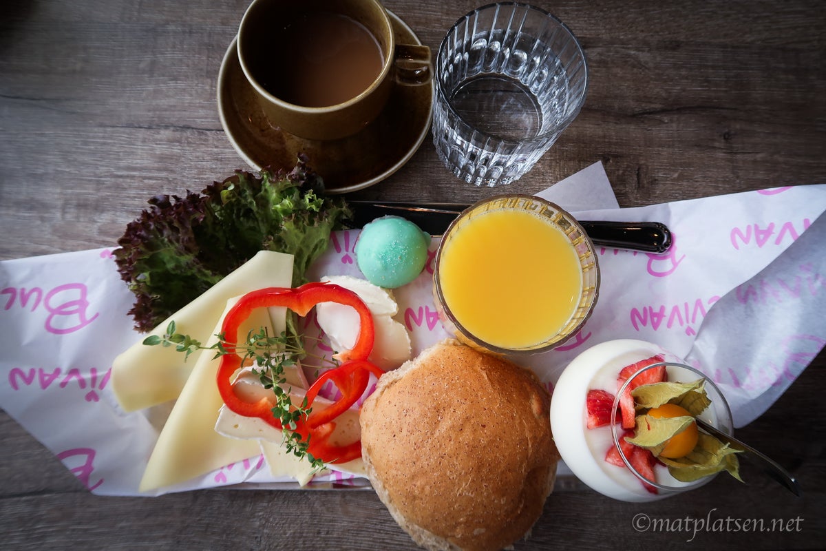 Kaffe/the, apelsinjuice, vaniljyoghurt med bär, fralla (jättegod) med ost, brieost, Philadelphia, paprika och sallad samt en minibiskvi. Pluspoäng för trevligt upplagt.