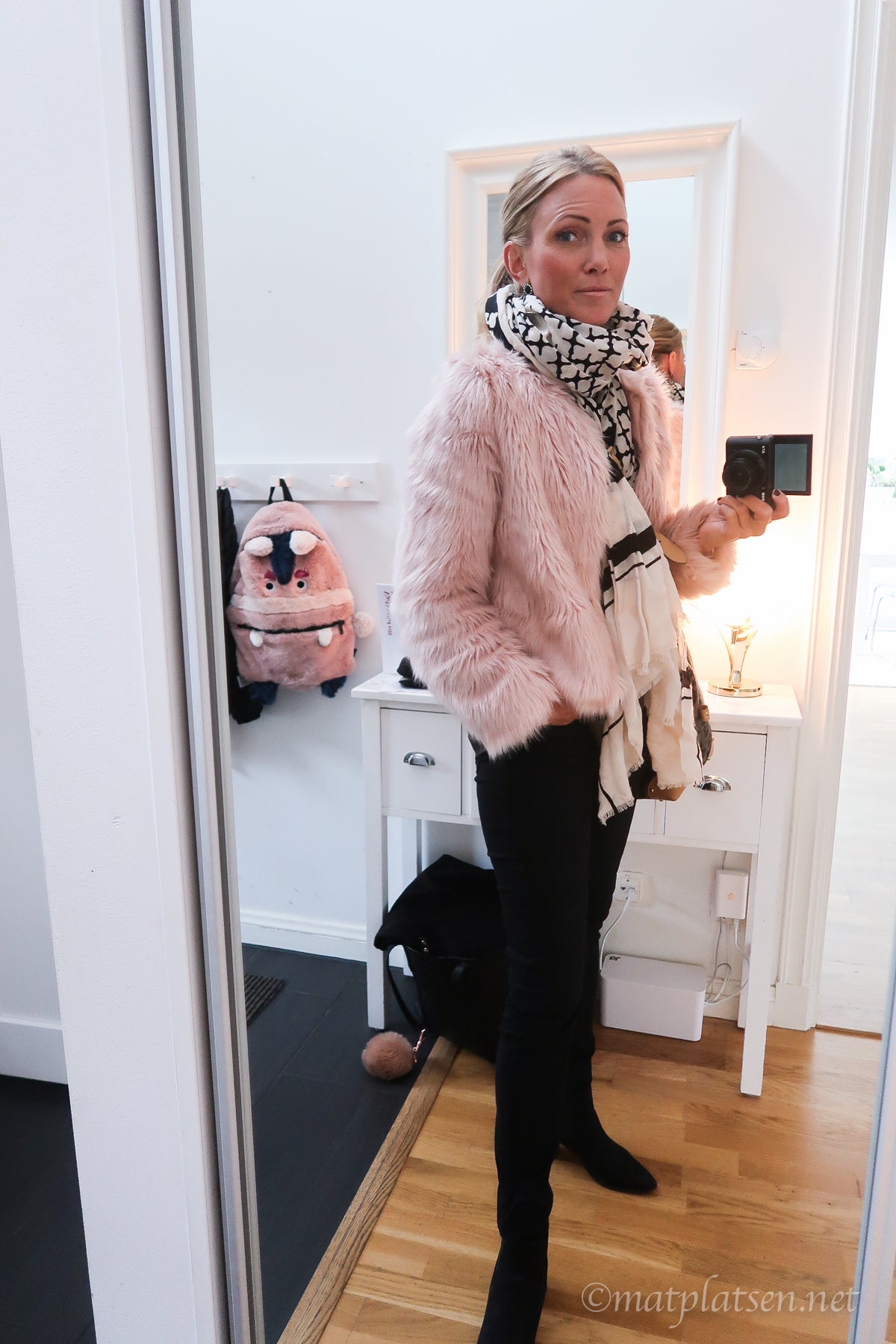 Hade ny grön singoallablus på men den hamnade inte på bild, nya örhängen som matchade från H&M, pälsjacka Gina Tricot (gammal), scarf by Malene Birger, byxor H&M och väska Mulberry.