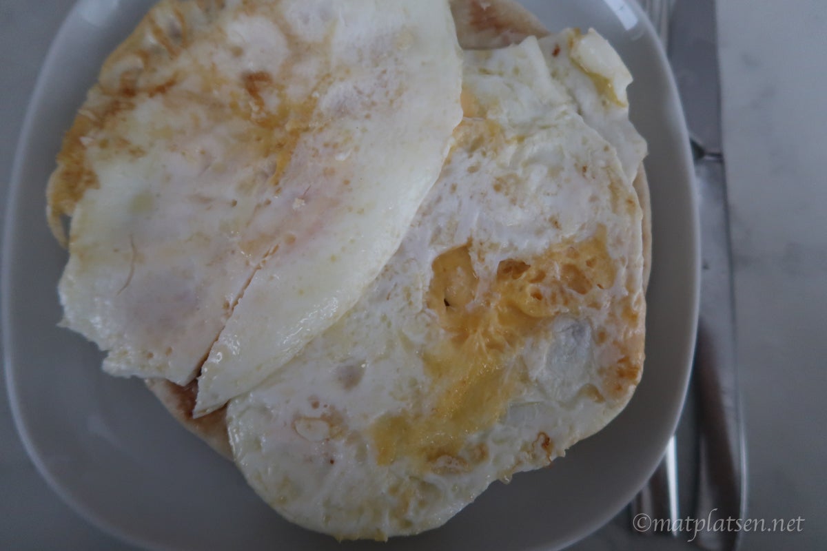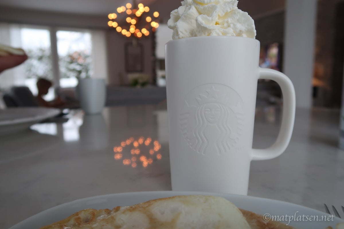 Varm choklad med vispgrädde och hällakaka med stekta ägg – herreguuud vad gott.