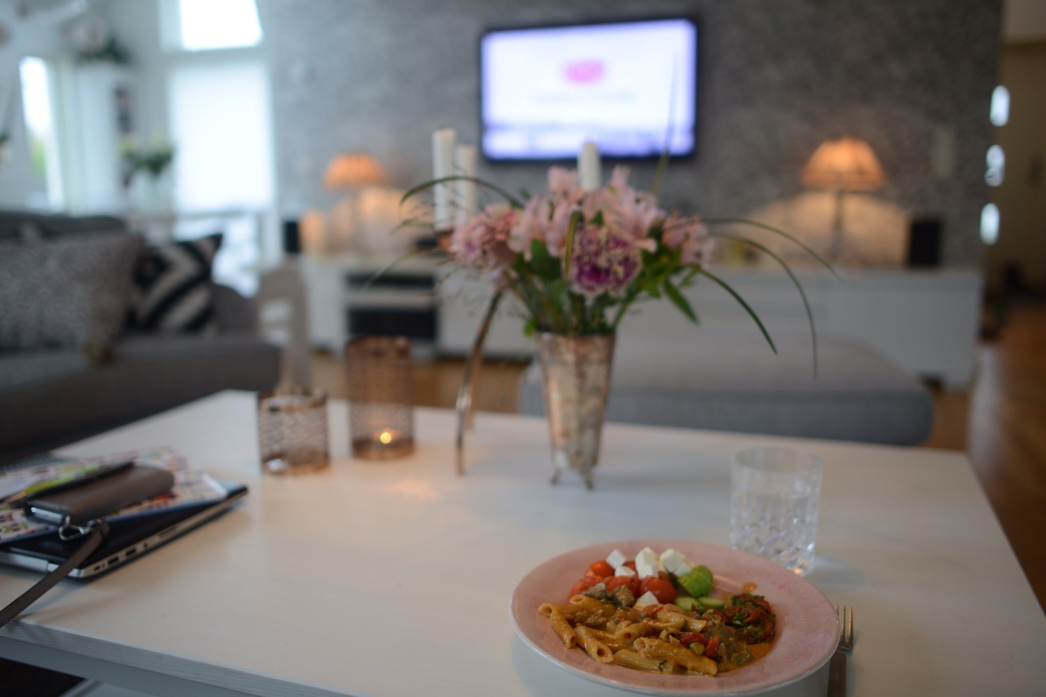 Lunch! Rester av pasta med oxfilé i gräddsås, soltorkade tomater i pesto och grekisk sallad. Till det resten av gårdagens avsnitt Pretty Little Liars jag somnade i från i går. Men jag blir tokig på textningen som är gjord med google translate. Kul i början men nu är det grymt störande, inte ett rätt!