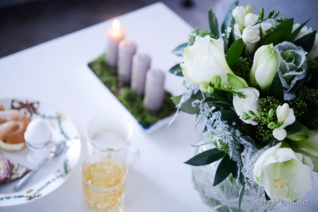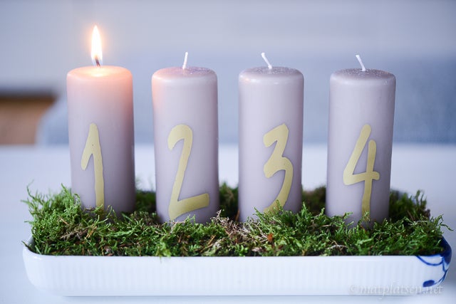 1:a ljuset är tänt. Året adventsljusstake byggde jag ihop av ett litet avlångt fat från Royal Copenhagen (Musselmalet mega), grön mossa och ljust ljungfärgade adventsljus från Hemtex (så lagom stora, inget fan av jätteblockljus).