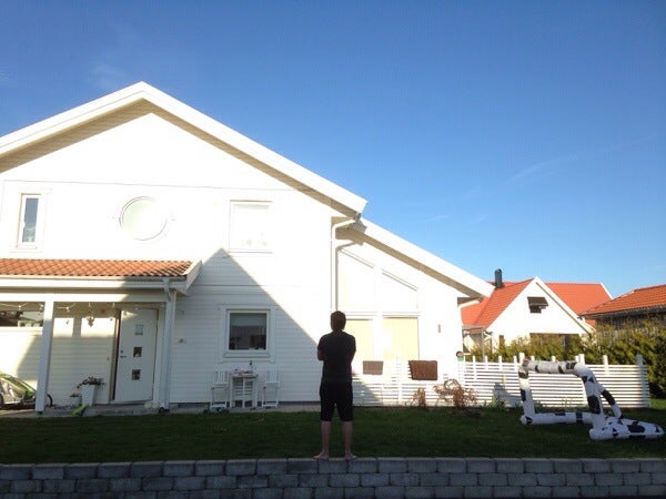 Ni ser, solen borta från framsidan nu men hade man en balkong utanför sovrummet (där det är nerdraget) kunde man sitta där. Frågan är bara om man ska ha en liten utanför sovrummet bara eller en som sträcker sig längs hela övervåningen fram? (Dvs byta ut taket över entrén på nåt sätt och göra en lång balkong längs med alla fönster) Klurar vidare..