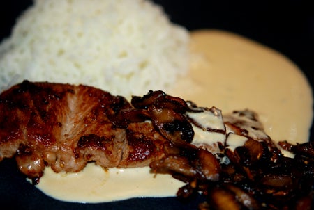 I går åt vi baconlindad fläskfilé fylld med vitlöksost, klyftpotatis och grönpepparsås till middag. Blev