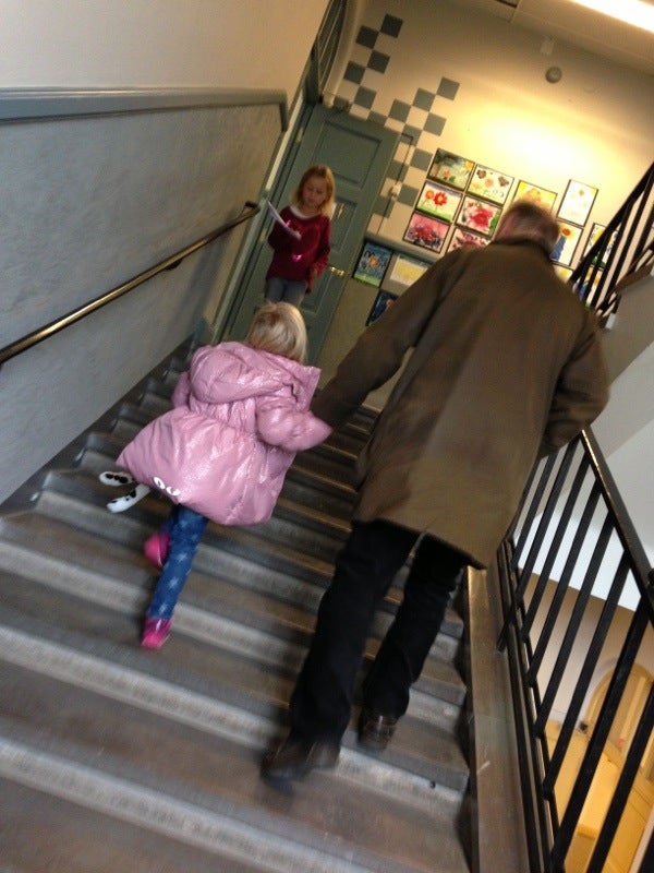 Lämnar Olivia i skolan. Med sällskap av morfar (som skjutsar mig till tåget)