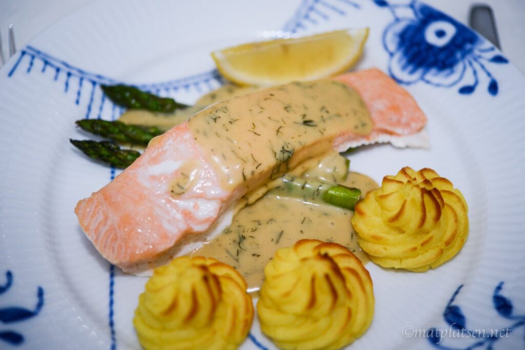 Ugnsbakad lax med sherrysås och pommes duchesse. Så gott! Lax med smakrik sås