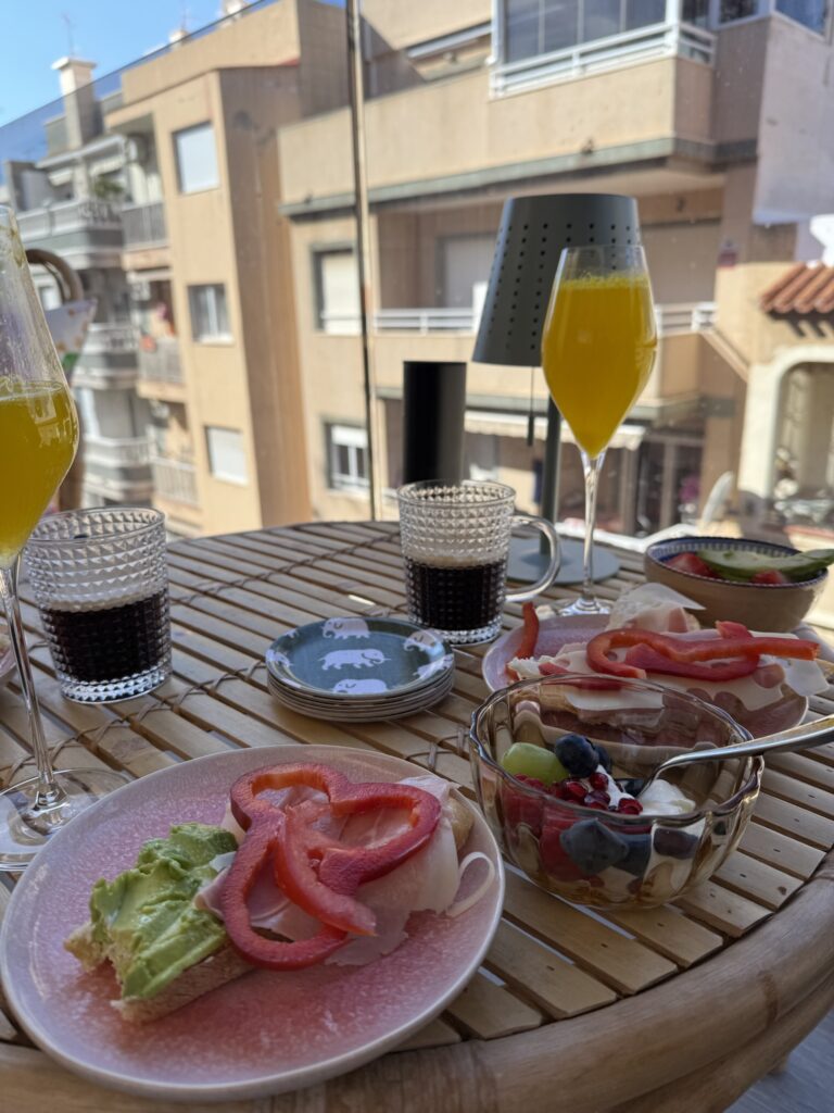 Fredagen började med långfrukost på balkongen. Mimosas med färskpressad juice, yoghurt med frukt och bär,