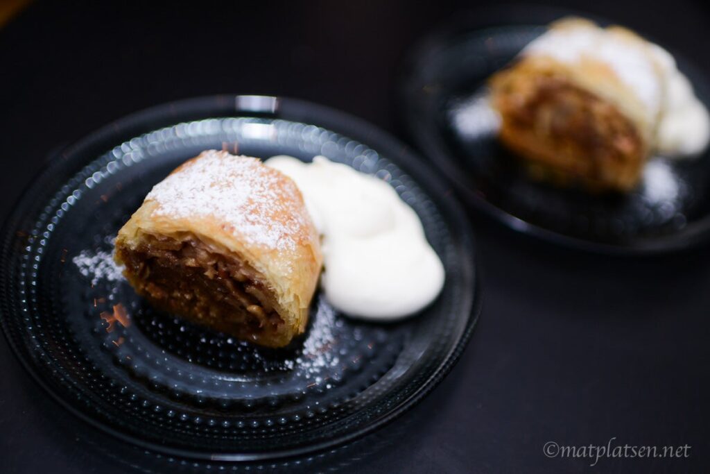 Äppel- och päronstrudel med romgrädde