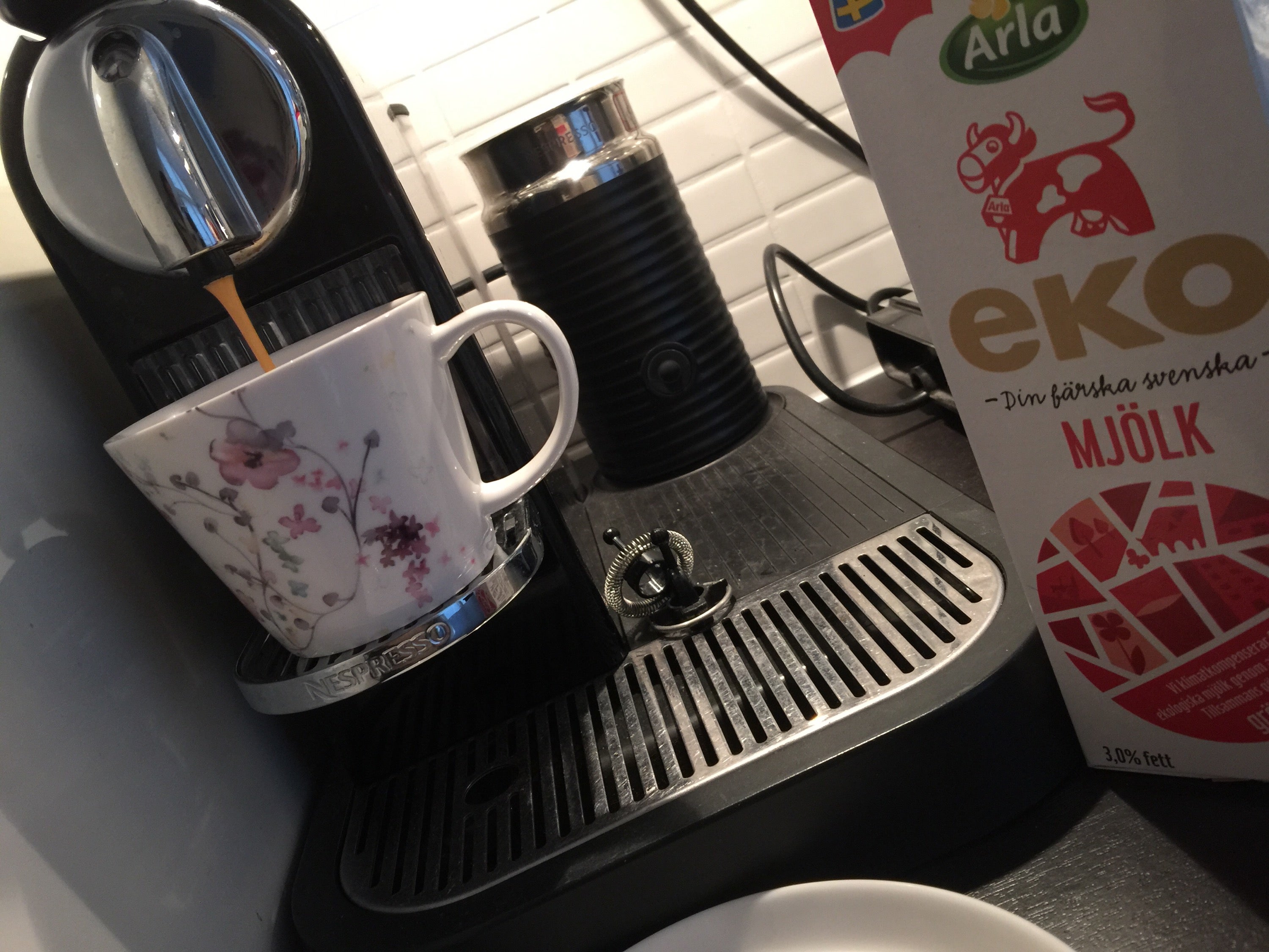Dagens första kaffe (cappuccino – koffeinfri såklart ;-)). Sällskap av pappa som hjälper mig med lite datastrul och formaterar minneskort. Min egen data-support!