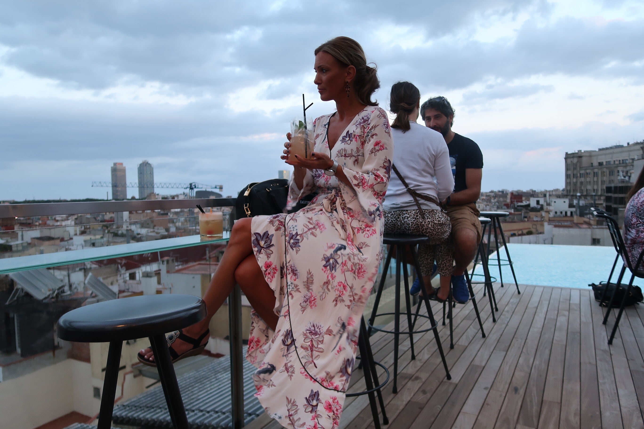 Mer från Barca medan jag minns 🙂 Ena kvällen satsade vi på en fin restaurang. Hittade Acess på Tripadvisor som fått fina omdömen. Började med en drink på vårt hotells rooftop (Grand Hotel Central). Vacker utsikt, vackra drinkar och en vacker kväll med stora grå moln som dundrade förbi. Mäktigt! (Var ju så varmt så gjorde ingenting).