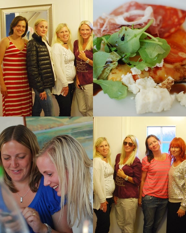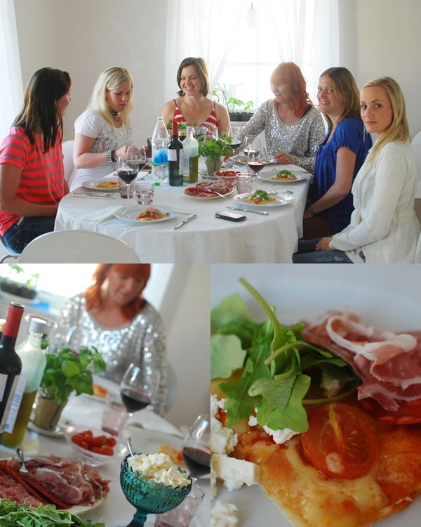 Ann bjöd på pizza till. En färdiglagad pizzabotten med olika ostar, tomatsås och tomater. Sen fick man lägga på kalla tillbehör själv efter tycke och smak, så kul idé! I skålar och fat serverades sedan krämig fetaost, parmaskinka, salami, succola, tomater och balsamico vinäger. Mums!