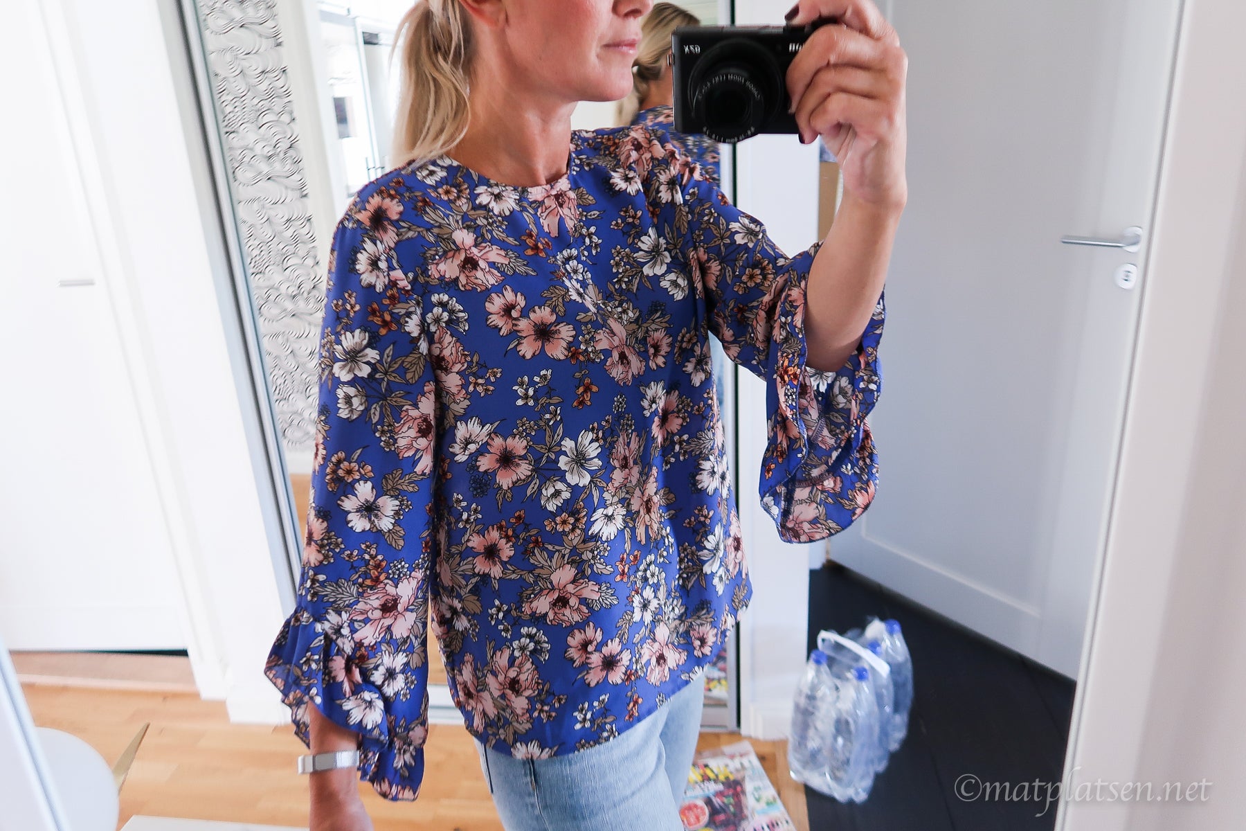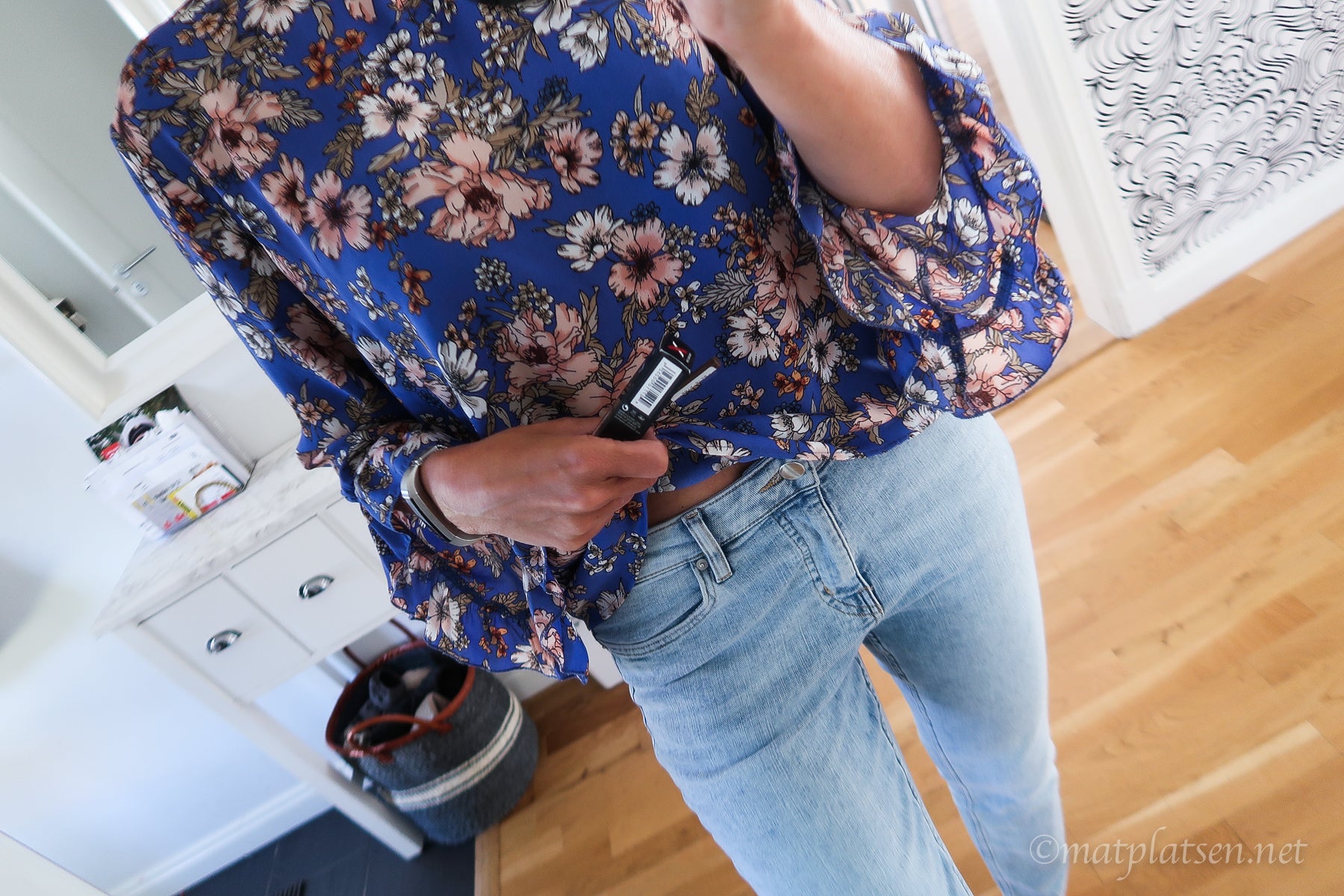 Jag har blommig blus i en modell jag älskar och har i 3 (!) färger, bra pris finns HÄR. Och jeansen är ursköna ”cropped jeans” från H&M (såsådär 7/8 längd på benen som är så snyggt).