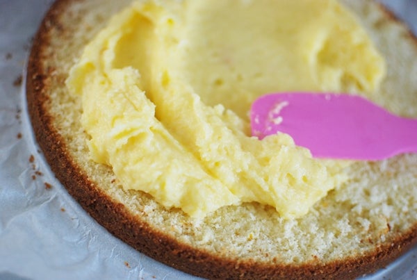 Häll smeten i formen och grädda i ca 40 min i 175 C. Låt kakan svalna och dela den sedan till två lager. Bred vaniljkrämen på botten och lägg på locket.