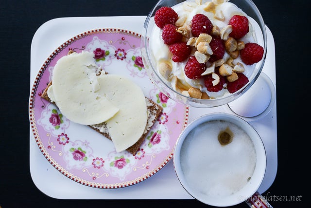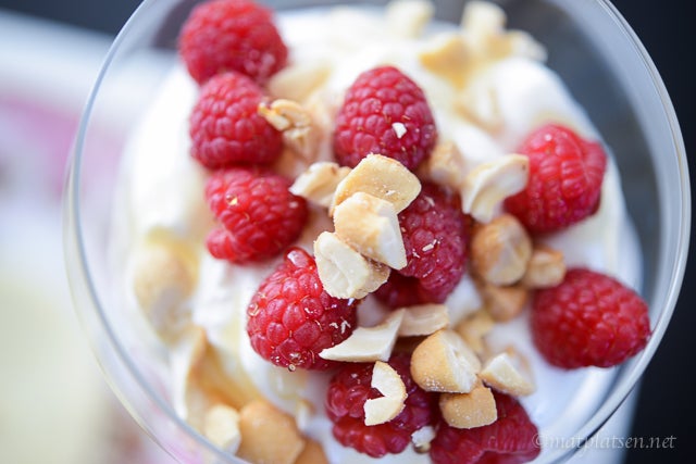 1. Rysk yoghurt (så len och mild och krämig och god!!) färska hallon, hackade cashewnötter och honung.