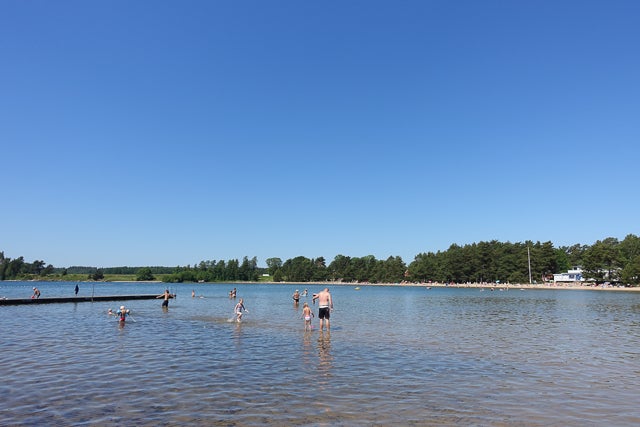 Lite långgrund sandstrand. Filtarna på sand eller gräs. Ok toaletter och en pytteliten kiosk för glass o kaffe. Gräsplan för barn som har spring i benen o vill sparka boll. Brygga men djupet längst ut är nog inte mer än ca 1.30 kanske….