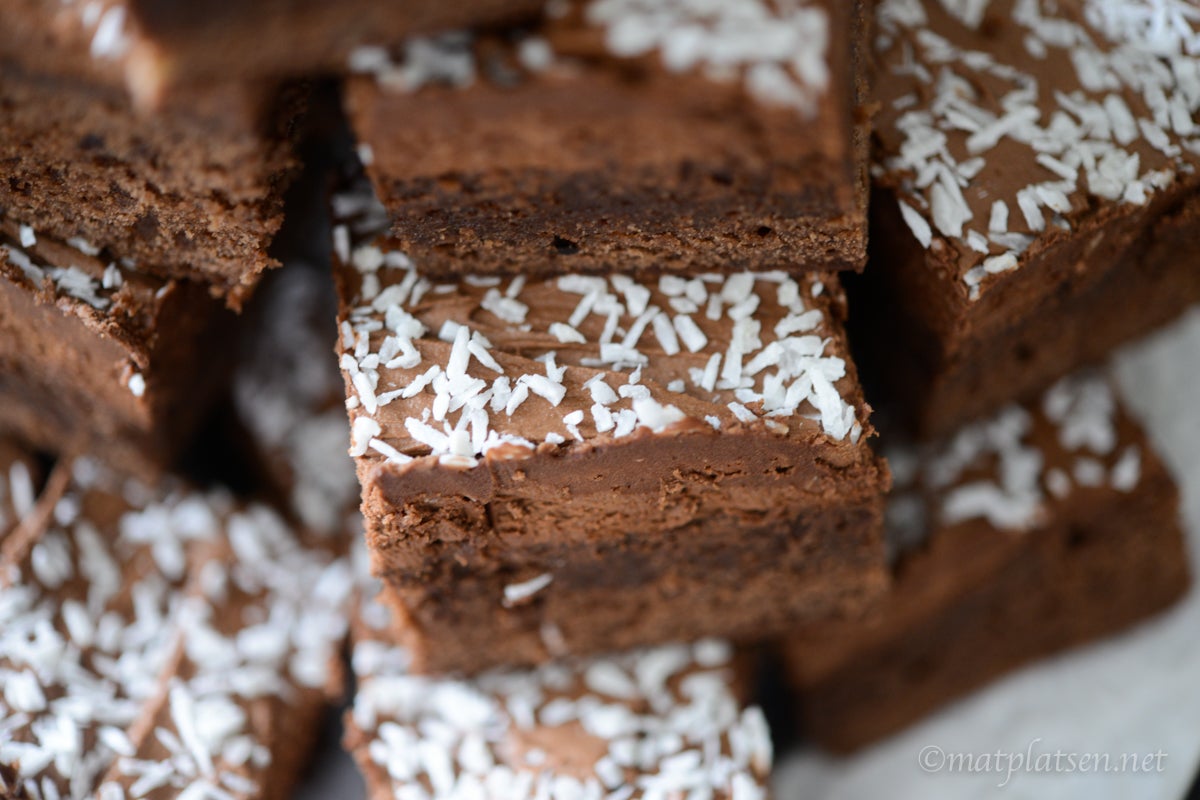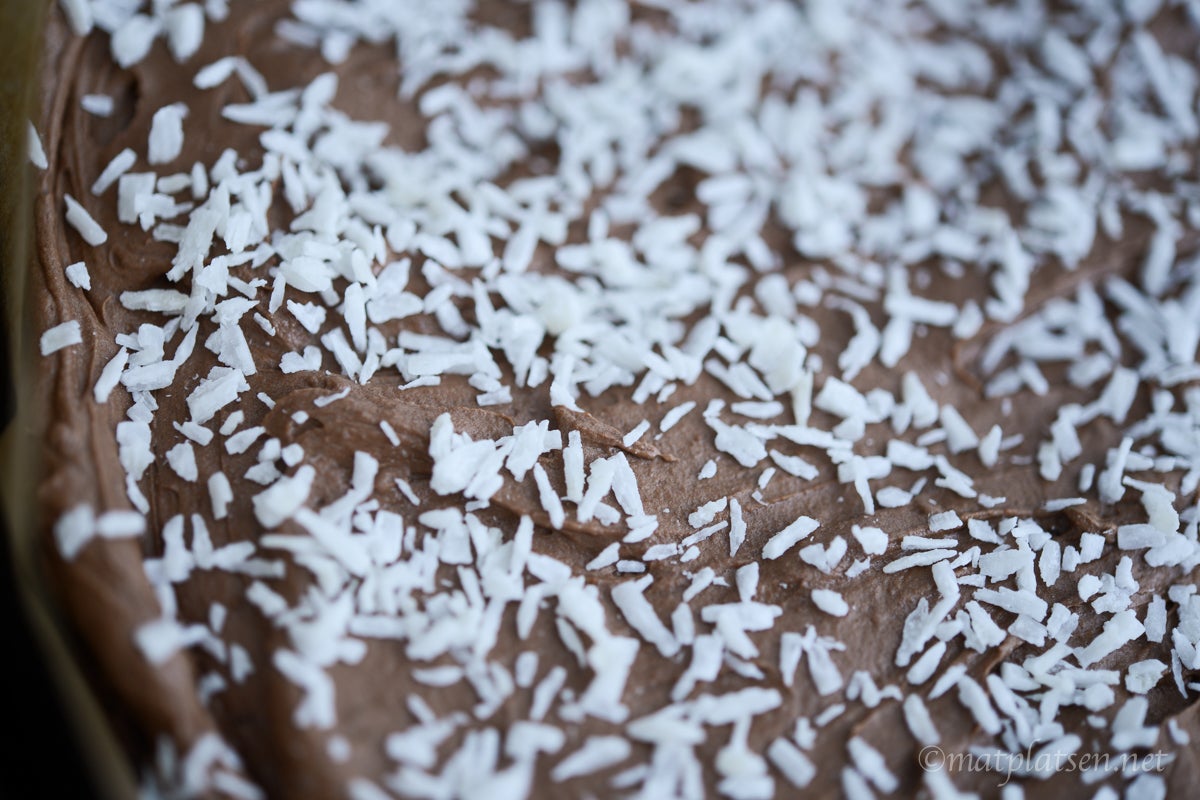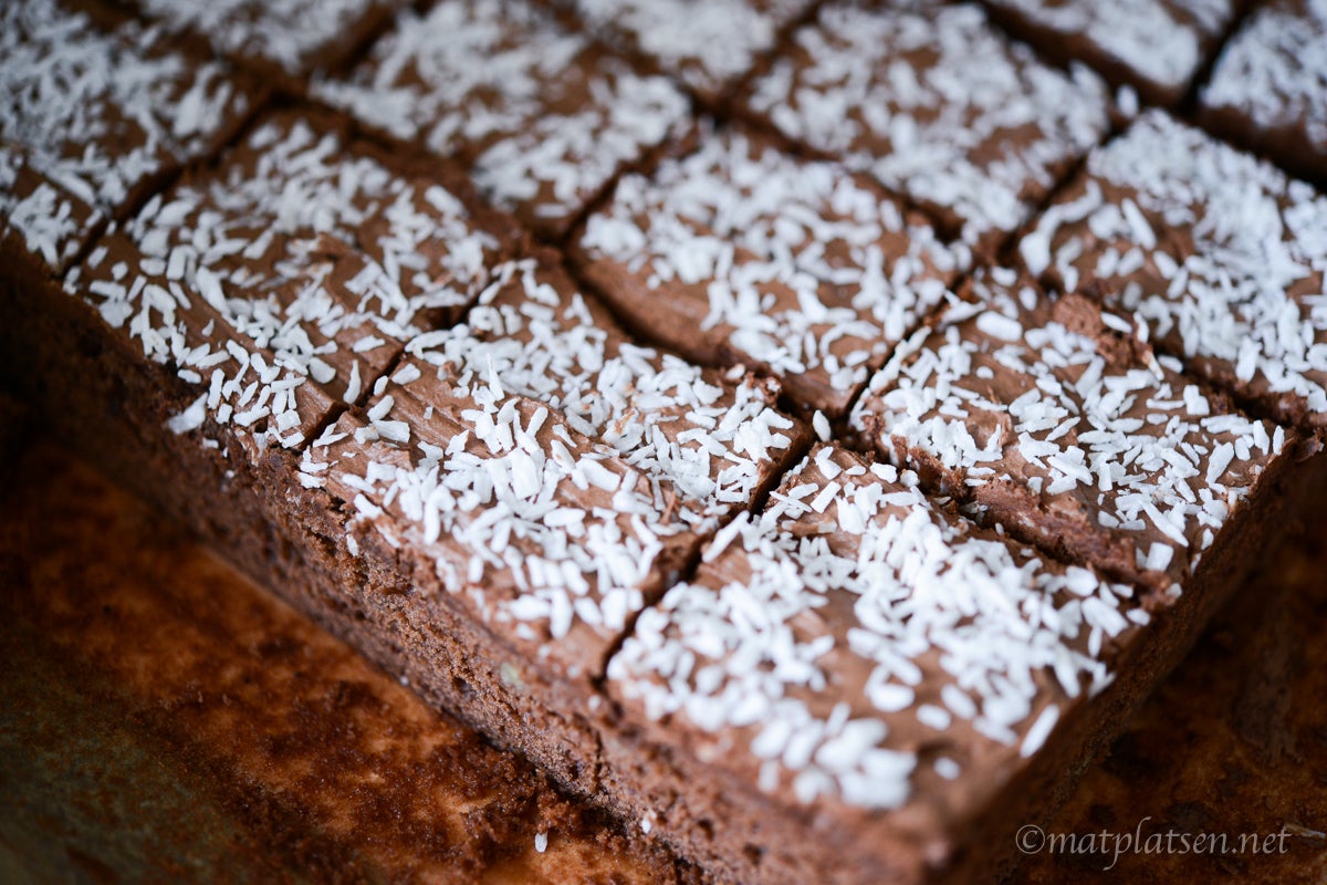 Glasyr: Smält chokladen över vattenbad eller i mikro. Låt svalna något. Vispa ihop med smöret. Tillsätt kakao, vanilj och florsocker och rör till en fluffig glasyr. Bred glasyren över kakan och strö över kokos. När glasyren har satt sig, skär kakan i bitar.