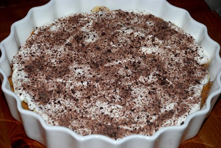 Smula kexen fint och blanda med smält smör. Tryck ut degen i en pajform och ställ kallt tills tofféen är färdig. Kyl sen den oöppnade burken i kallt vatten och bred ut tofféen över pajskalet. Skiva bananerna och lägg ovanpå. Vispa grädden och bred över och strö till sist flisad choklad överst.