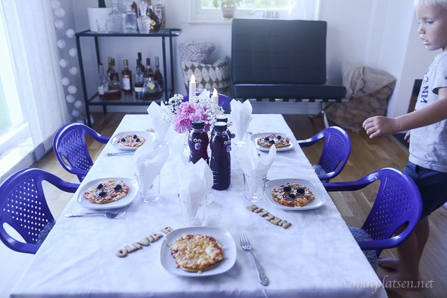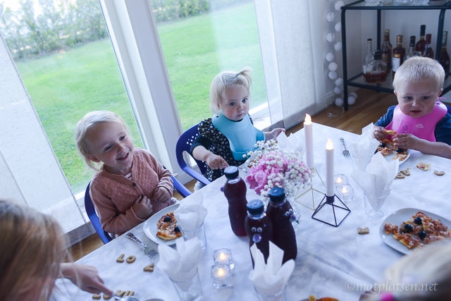 Vi hade ju vänner över på middag i fredags. Börjar med barnen. De fick eget bord och portionspizzor med valfri topping. Till efterrätt blev det fåret Shaun-tårta (recept HÄR). Och efter middagen fick de plocka godis från lilla kiosken i små påsar och se film.