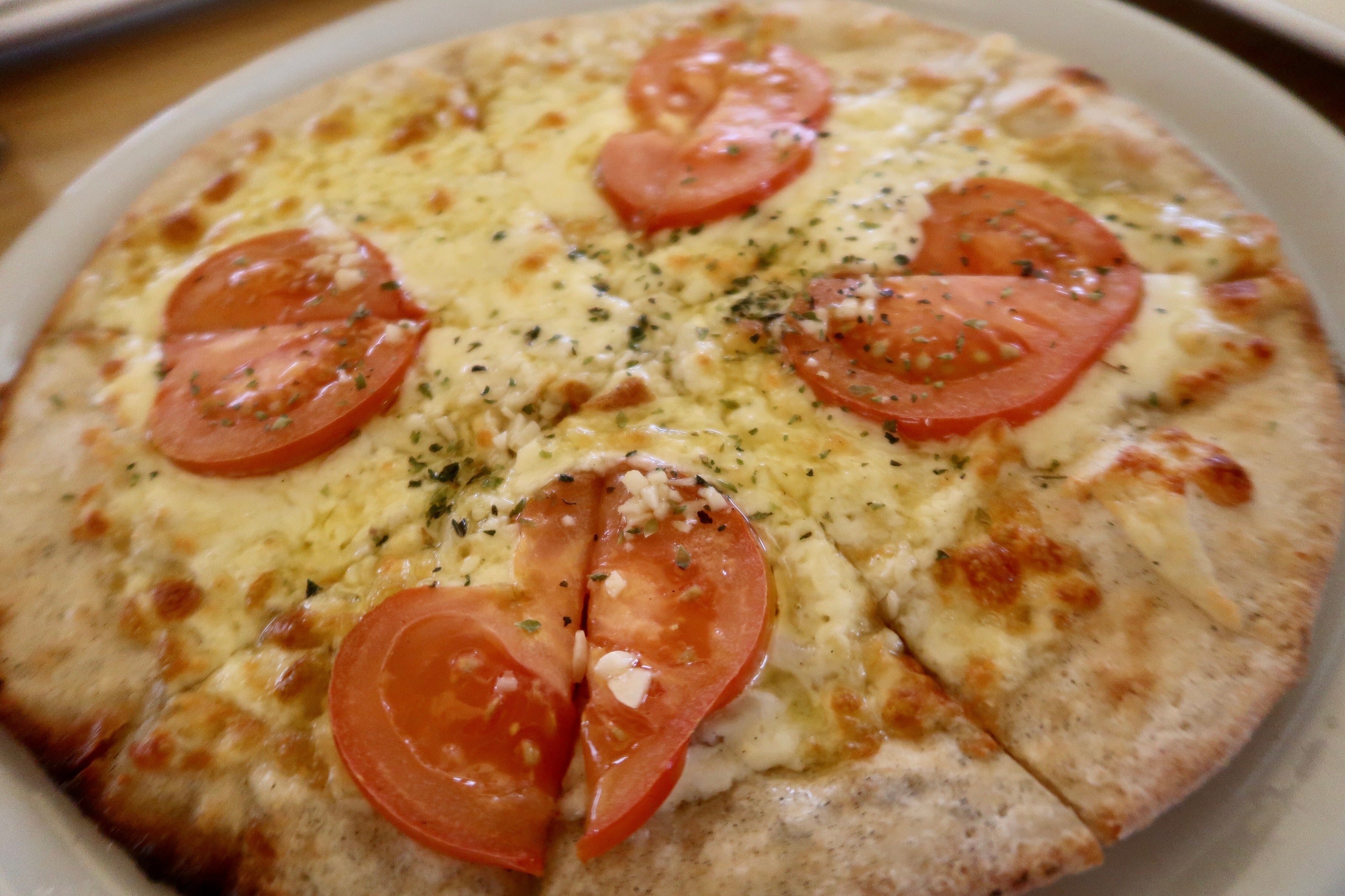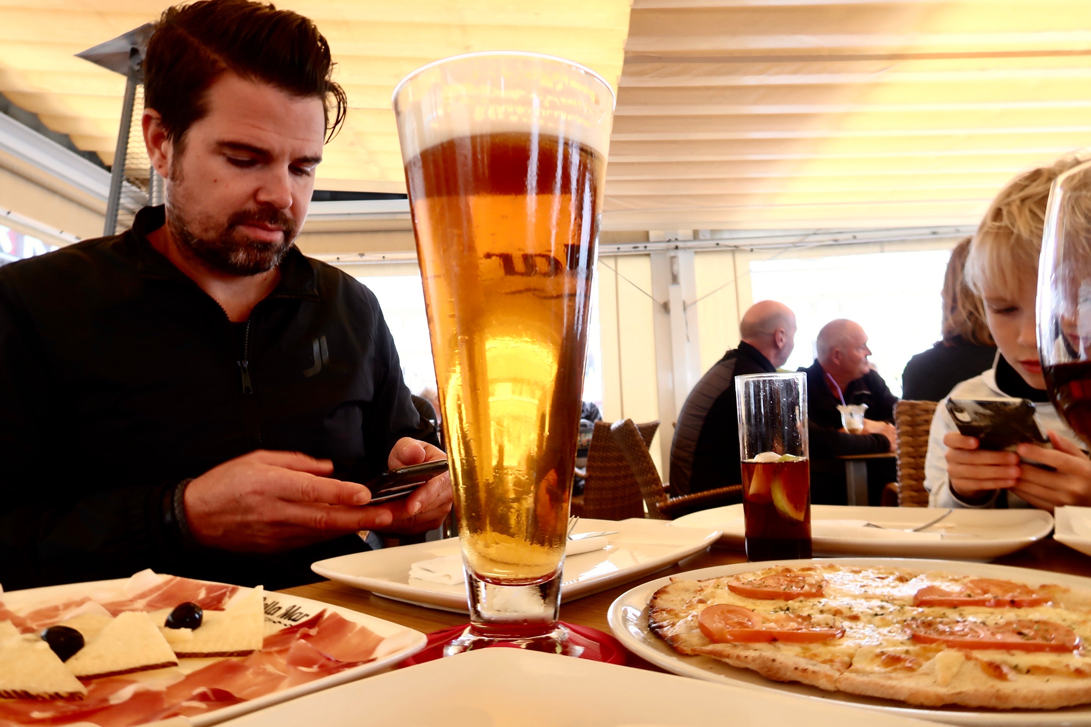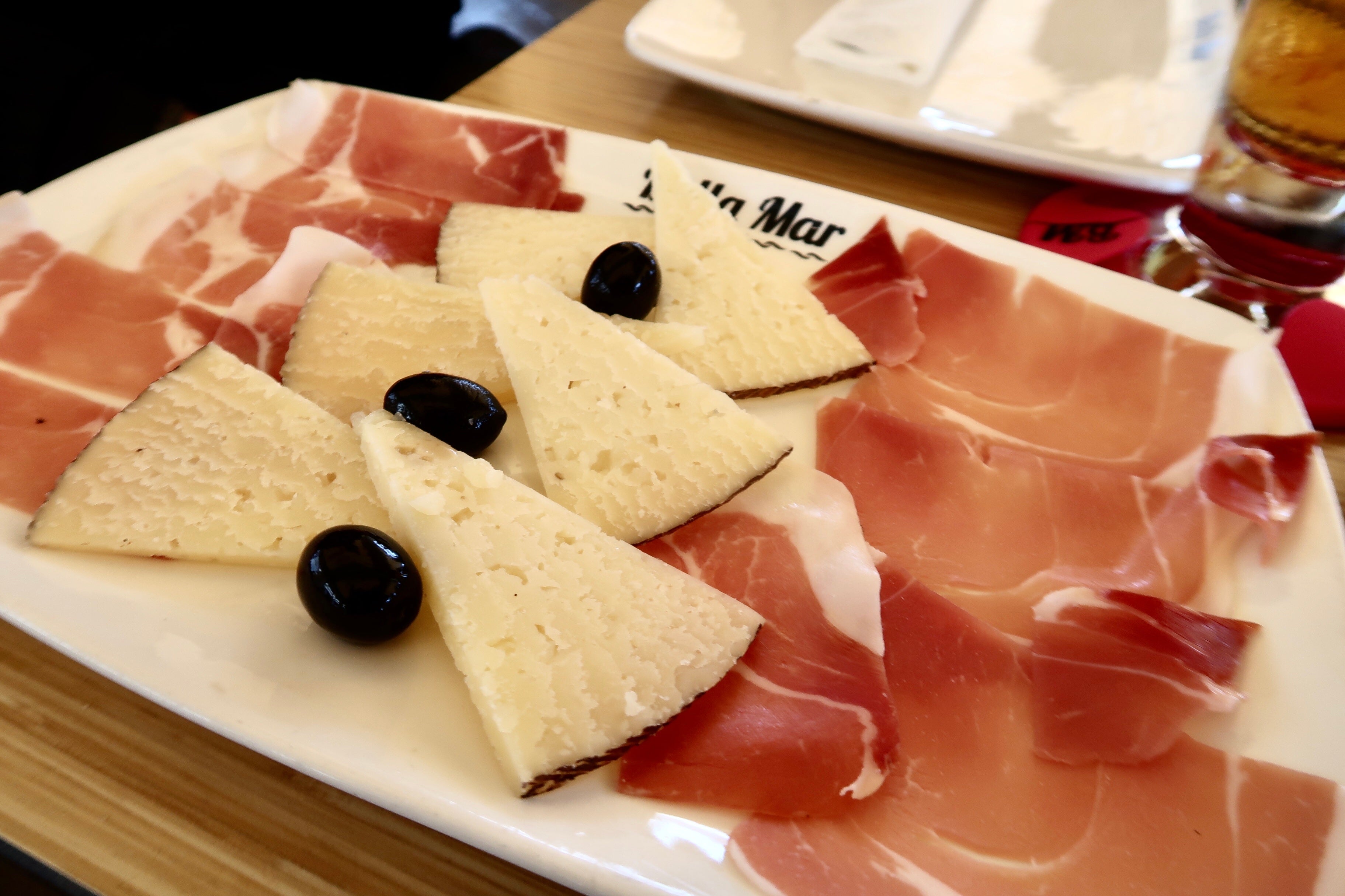 En grande cerveza är en STOR öl här kan man säga. Beställde in lite smått plock att dela på, ostar och jamon, pommes och ett vitlöksbröd som visade sig vara mer som en pizza och helt galet god!!