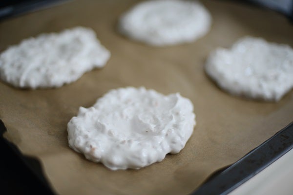 Vispa äggvitorna med sockret till ett hårt skum. Vänd ner flingorna i marängen. Klicka ut marängen till 4 runda kakor på ett bakplåtspapper. Grädda i 125 grader i 60 minuter.