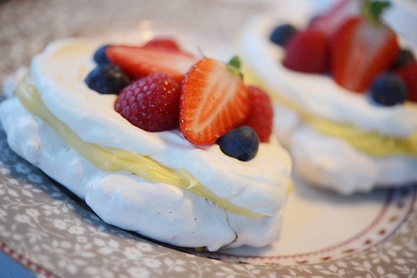 Riskripsies-pavlova med vaniljsmörkräm och färska bär