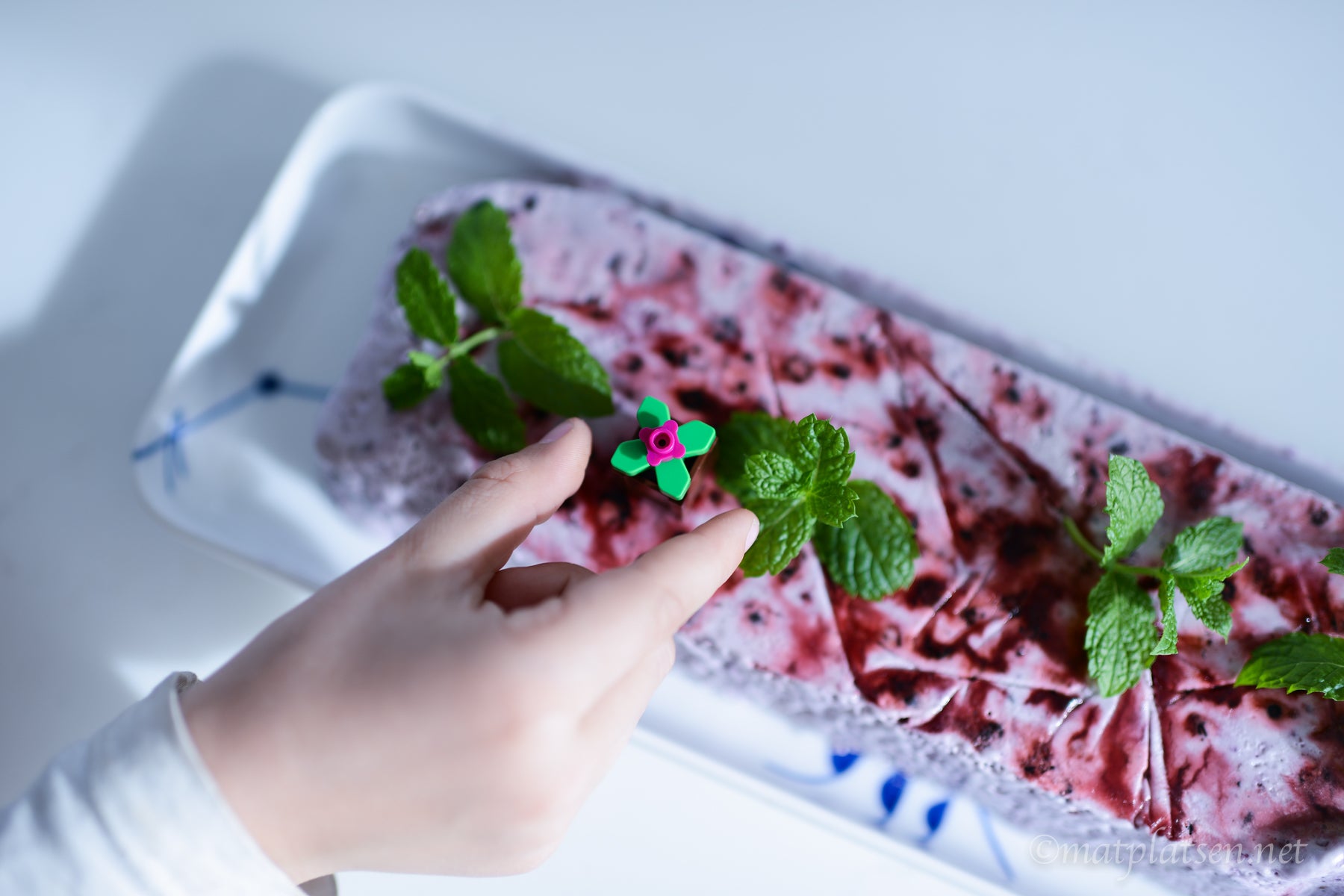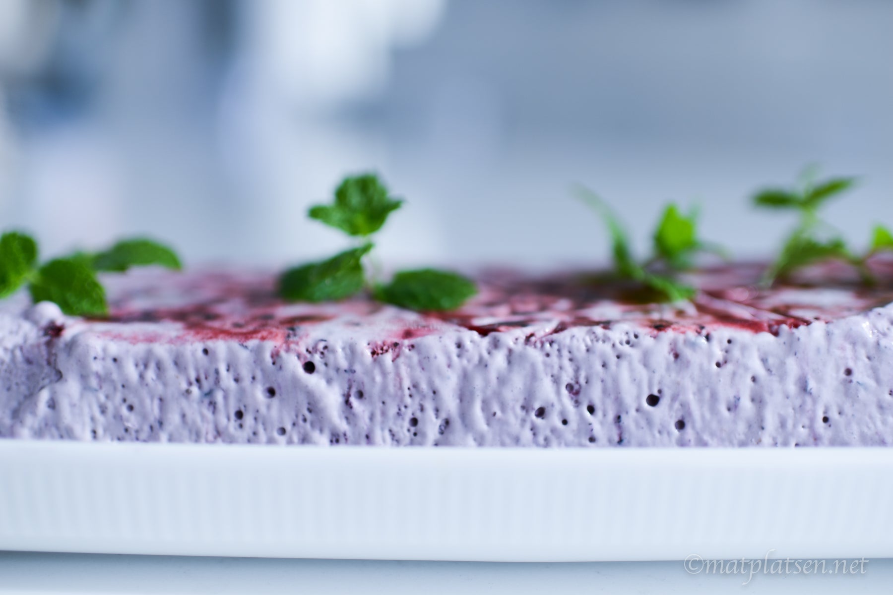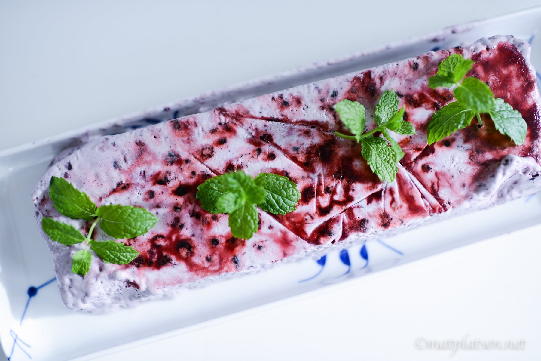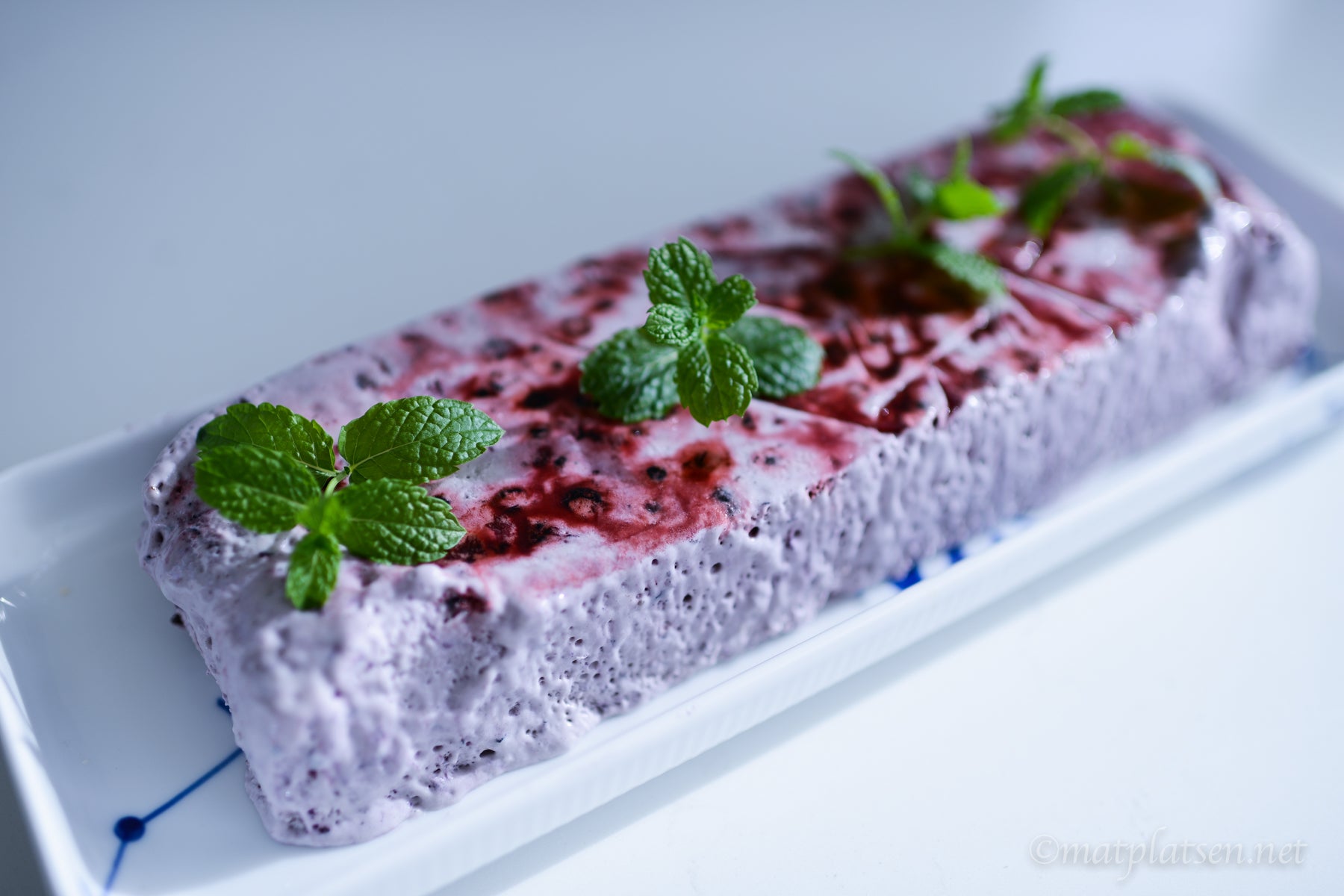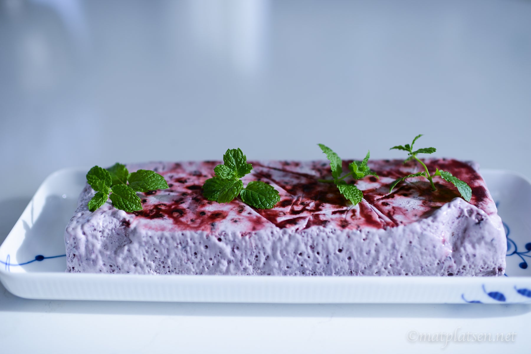 Vispa grädden fast och vänd ner den i ägg- och blåbärsblandningen. Häll upp i en form. Ställ i frysen minst 6 timmar. Ta fram och ställ i kylen ca 30 minuter före servering.