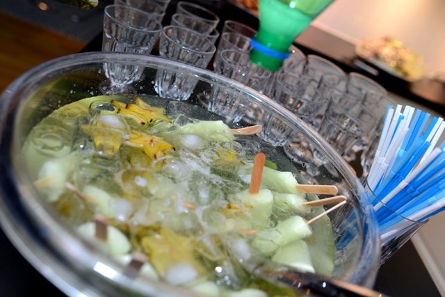 I år hann jag fota välkomstdrinken 🙂 men inte smaka… haha. Men den var visst försvinnande god som sist. Fyll en bålskål med frukter i grönt och en massa is. Häll på 1 flaska vodka, 2 liter sprite och ett paket piggelinglassar (fiska upp pinnarna när de smält). Rör om och servera när glassen smält.