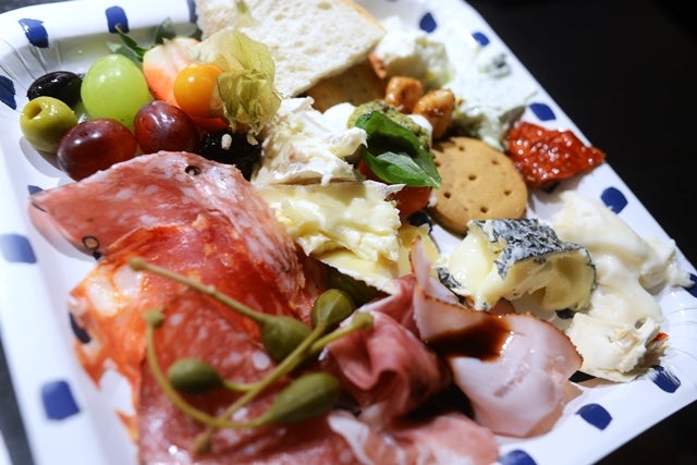 Vi var drygt 20 st så det fick bli plockmat. Ett fat med kex, ett fat med ostar, ett fat med frukter och ett fat med kallskuret, mozzarella/tomater/basilika, fetaoströra, basilikafärskost, vitlöksklyftor, sotorkade tomater, pesto, tapenade, bröd. Gott!