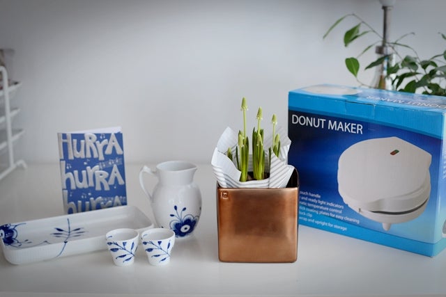 En donutmaker, en söt kruka i koppar med pärlhyacinter, äggkoppar, uppläggningsfat och såskanna från Royal Copenhagen. Och en underbar bukett i kvällens färgtema med bla hyacinter. TUSEN TACK!! Och tack för att i kom och gjorde kvällen <3
