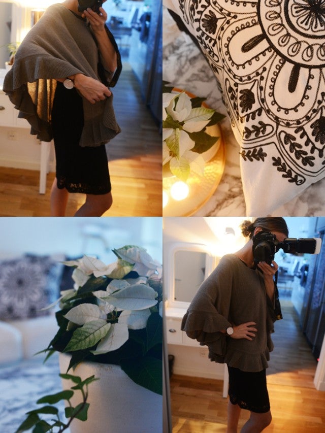 Mitt aaabsolut mest använda plagg i år måste vara cashmereponchon jag köpte på ett Homeparty med Evany tidigare i år. Det perfekta plagget att slänga på sig över en klänning eller som jacka eller över en tunnare jacka eller som i dag  – inomhus över vad som helst för att värma sig och samtidigt vara lite tjusig 🙂 (för visst känner man sig himla tjusig i poncho!) Den här gången blev det en med volangkant för att variera mig lite. Supernöjd!