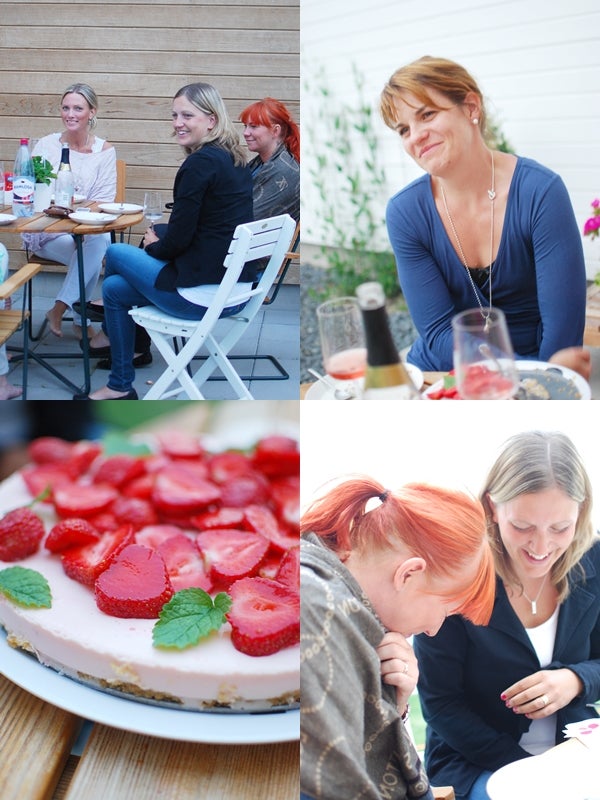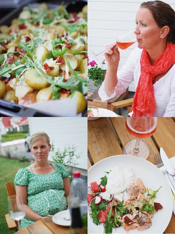 Malin var värdinnan för kvällen och bjöd på en jättegod laxrätt. Allt-i-ett långpanna med lax, färskpotatis, smält ost, soltorkade tomater + oljan, färska kryddor och ruccola. En melon & fetaostsallad till och en sås på turkisk yoghurt, fetaost och örter.