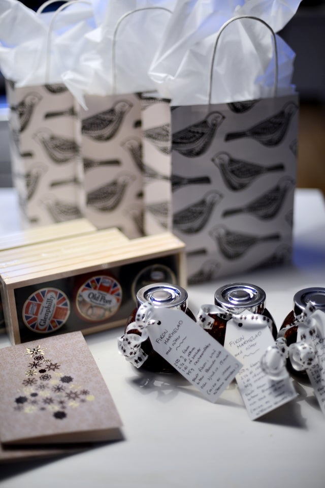 I påsarna gömde sig, förutom konstverken, 3 sorters ostar och hemlagad fikonmarmelad. En gammal favorit jag postat här förut men här kommer receptet på nytt om ni missat. Superenkelt och så gott till julens ostar!