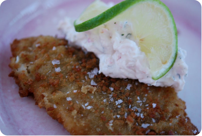 En djupdykning i frysen resulterade i lättpanerad rödspätta till lunch. Med en klick skagenröra och lite lime. Helt ok trots allt.