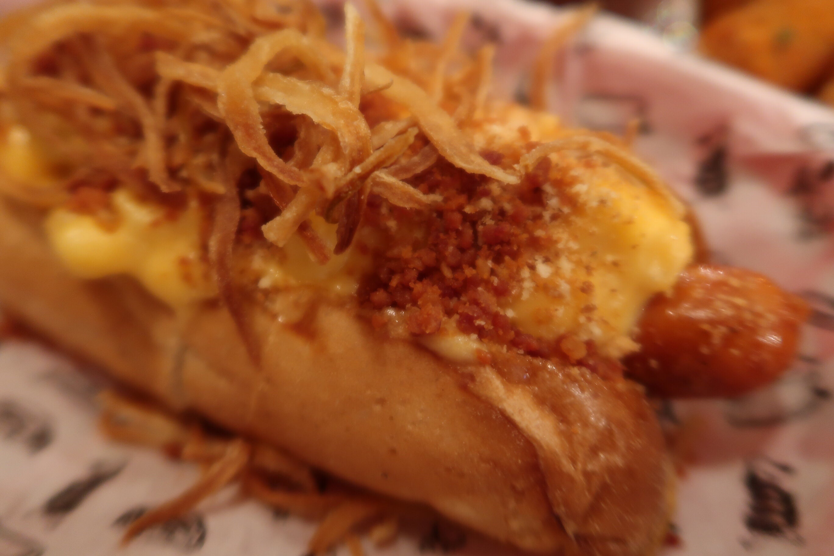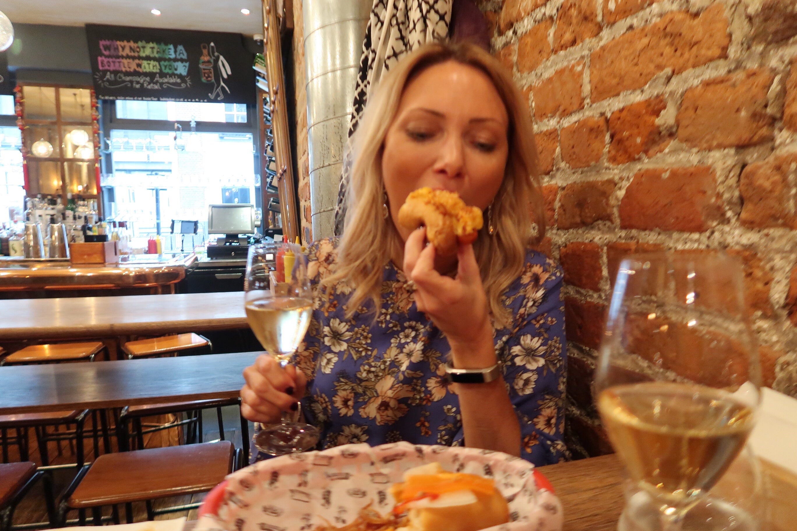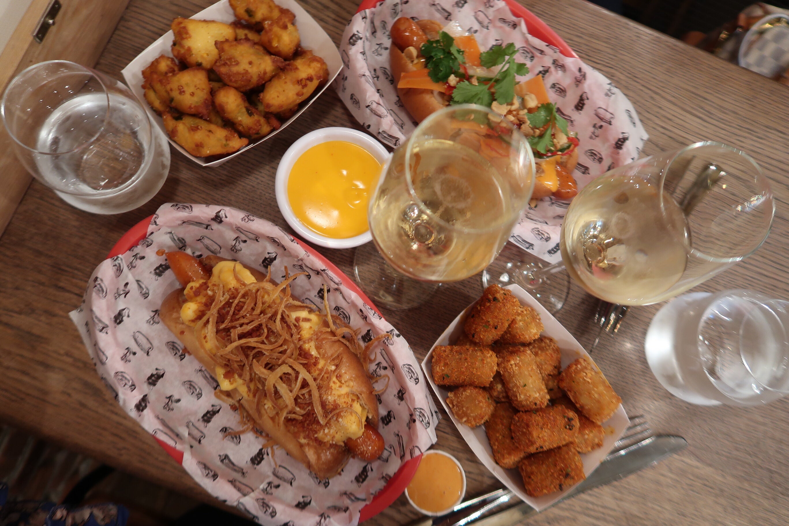 Klockrent som både lunch/snacks/middag. Man kunde beställa valfri korv + husets champagne för 10 £ eller välja själv ur en gedigen champagnemeny. Beställer man en flaska får man 2 korvar gratis. Välj mellan biff, fläsk eller vegetarisk korv. Fanns alla möjliga toppingar, vi valde storsäljaren med Mac n Cheese och lök och en med picklade grönsaker, srirashamajo, jordnötter och korriander och delade på. Beställde on ett par sideorders också, några slags majs och jalapenobollar och små potatisktokettet med het krydda (svingoda).
