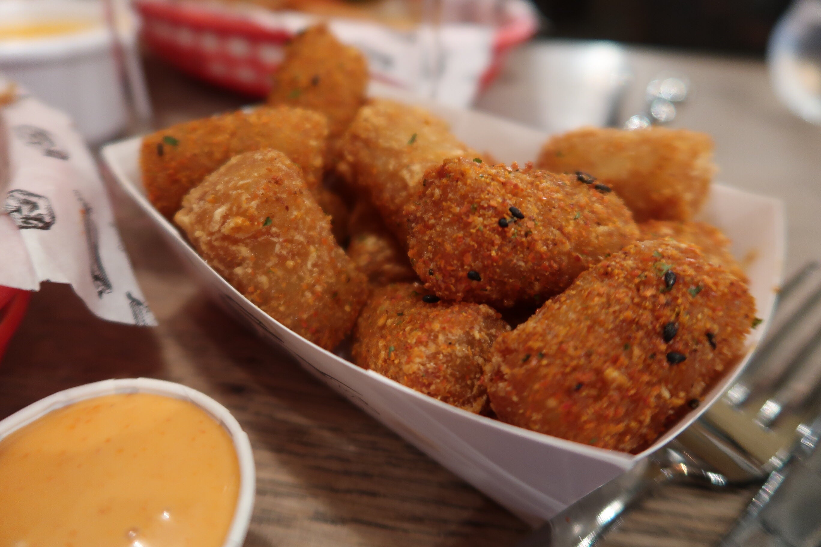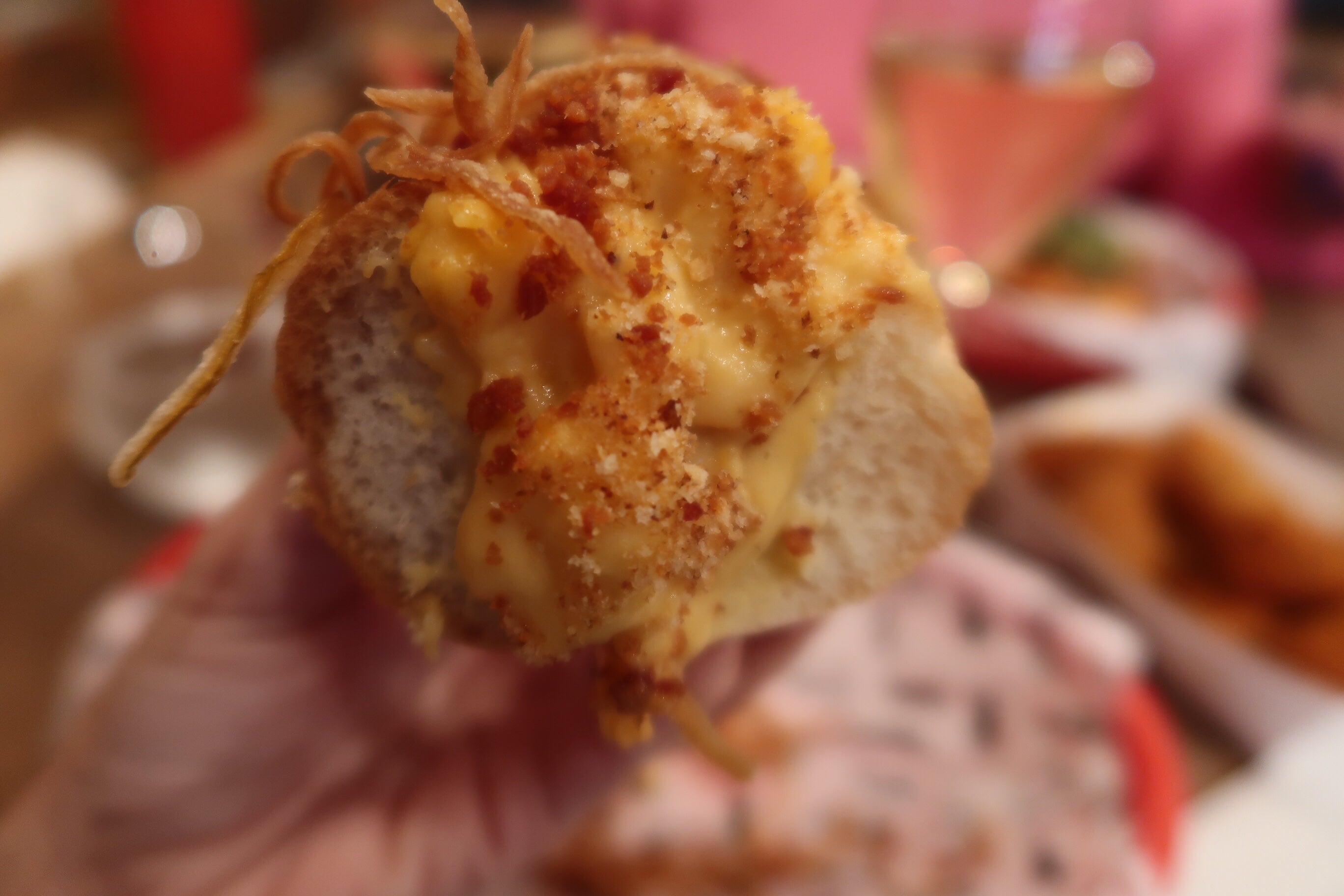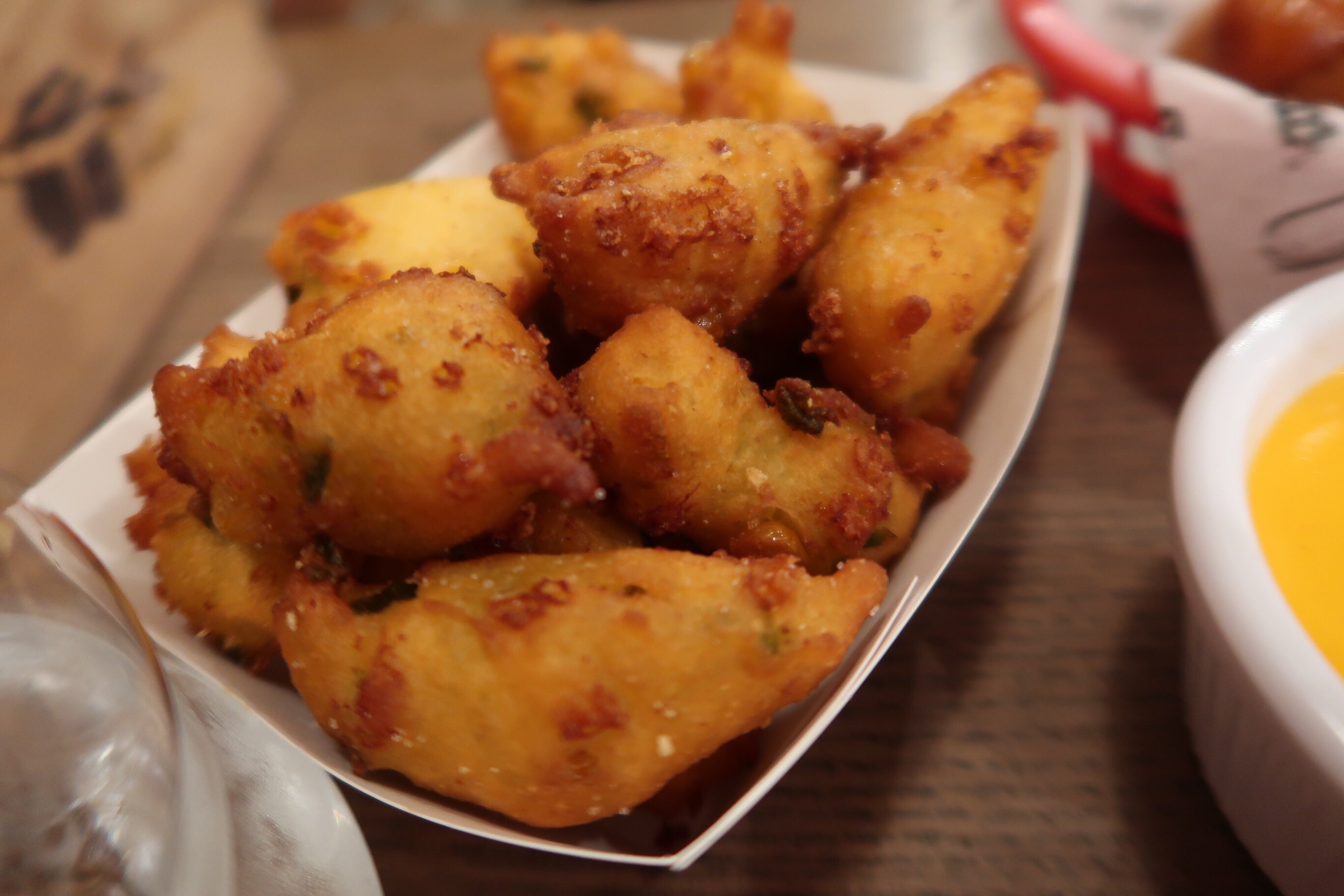 Klockrent som både lunch/snacks/middag. Man kunde beställa valfri korv + husets champagne för 10 £ eller välja själv ur en gedigen champagnemeny. Beställer man en flaska får man 2 korvar gratis. Välj mellan biff, fläsk eller vegetarisk korv. Fanns alla möjliga toppingar, vi valde storsäljaren med Mac n Cheese och lök och en med picklade grönsaker, srirashamajo, jordnötter och korriander och delade på. Beställde on ett par sideorders också, några slags majs och jalapenobollar och små potatisktokettet med het krydda (svingoda).