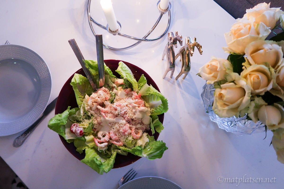 Ta av några blad och lägg dem hela runt kanten på en skål/fat (tack för tips Tessan). Skär resten i bitar och lägg i mitten. Häll på lite dressing och blanda runt. Halvera tomaterna och lägg i dem. Strö över hälften av osten. Skala räkorna och lägg dem överst. Ringla över mer dressing och resten av osten. (Vill man ha krutonger i kan man tillsätta det). Servera. Mums!!!