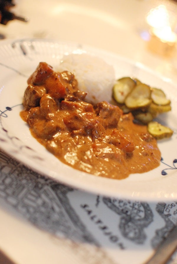(Grytan hittar ni recept på HÄR, jag gör samma men lägger till 3 dl grädde och låter puttra med på slutet, supergott!! Och recept på gurkan har ni HÄR)