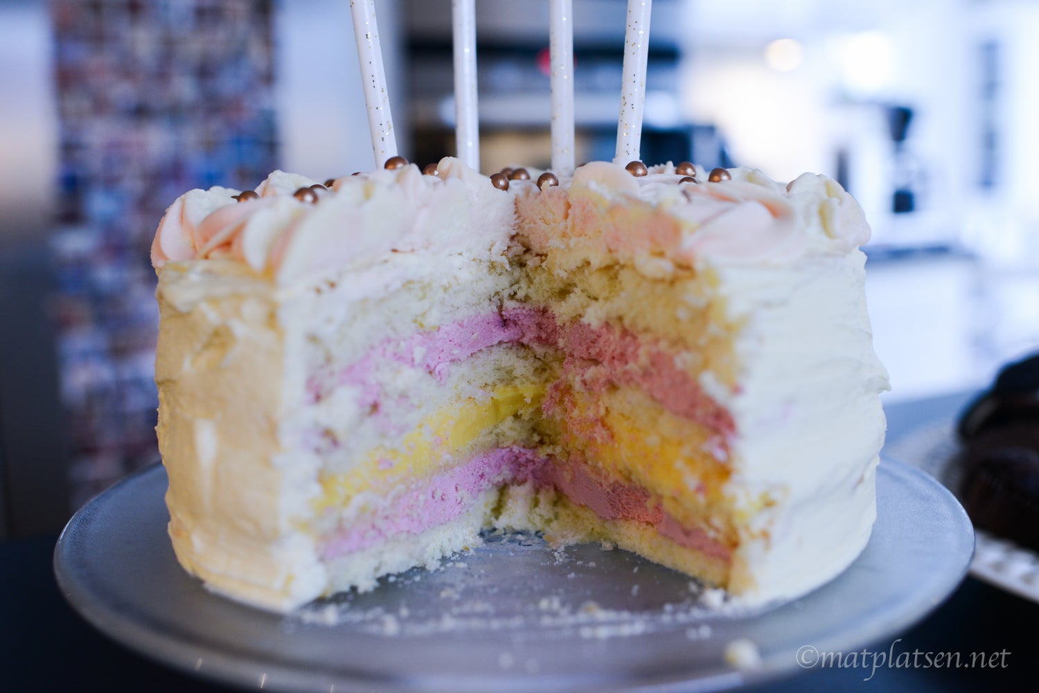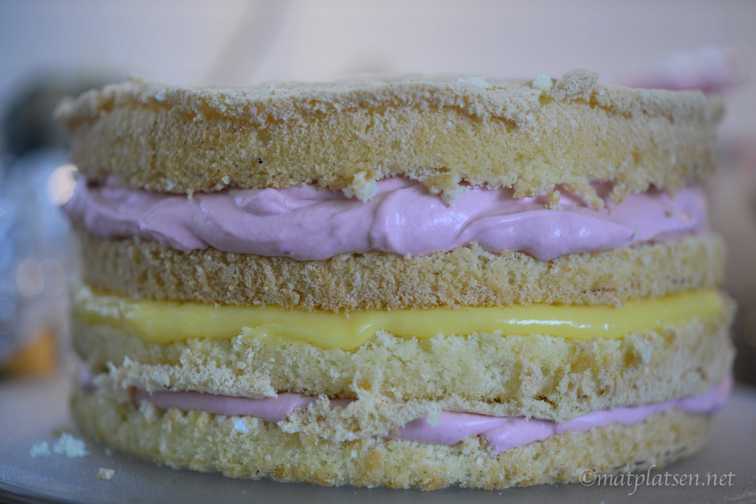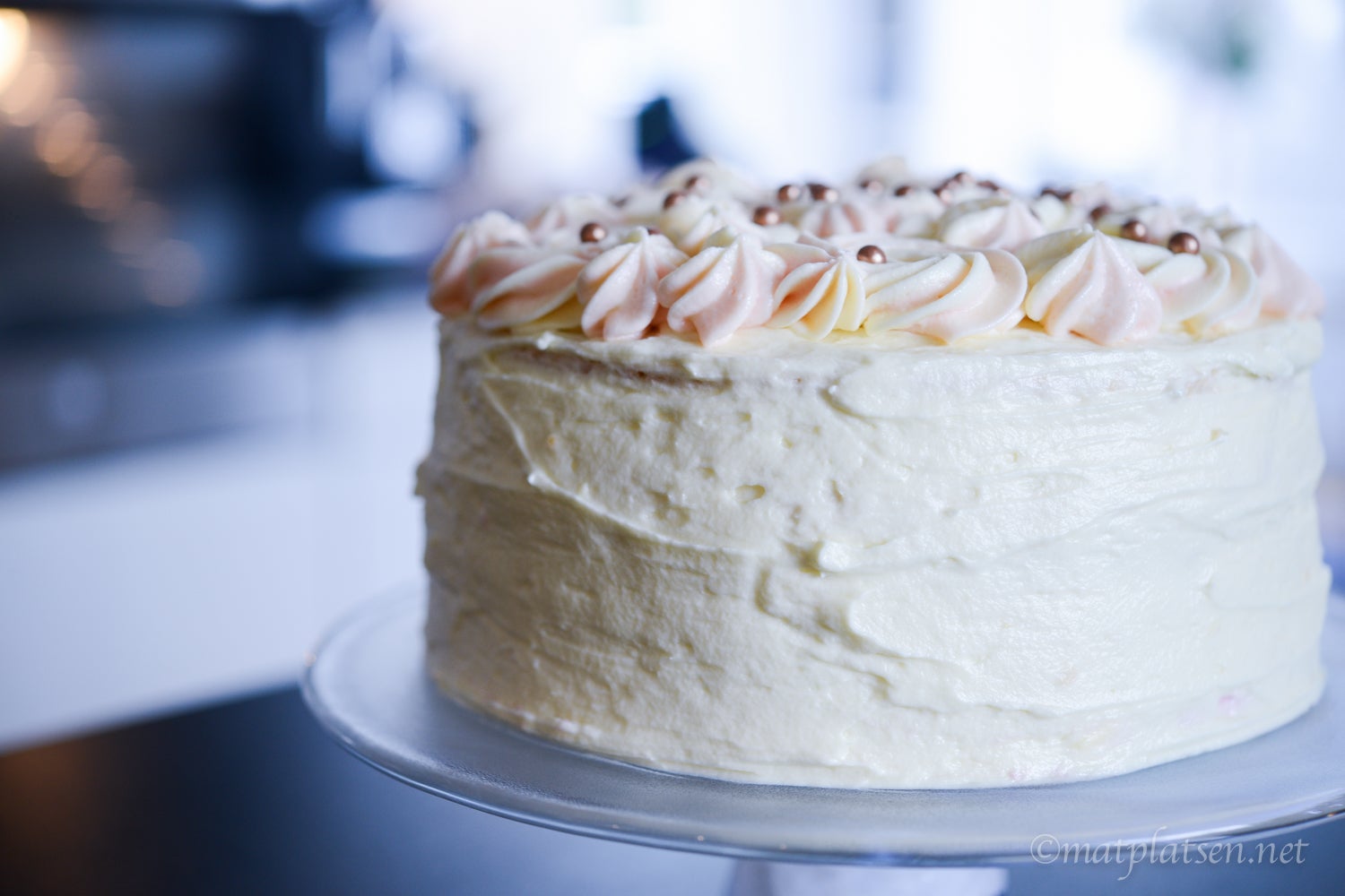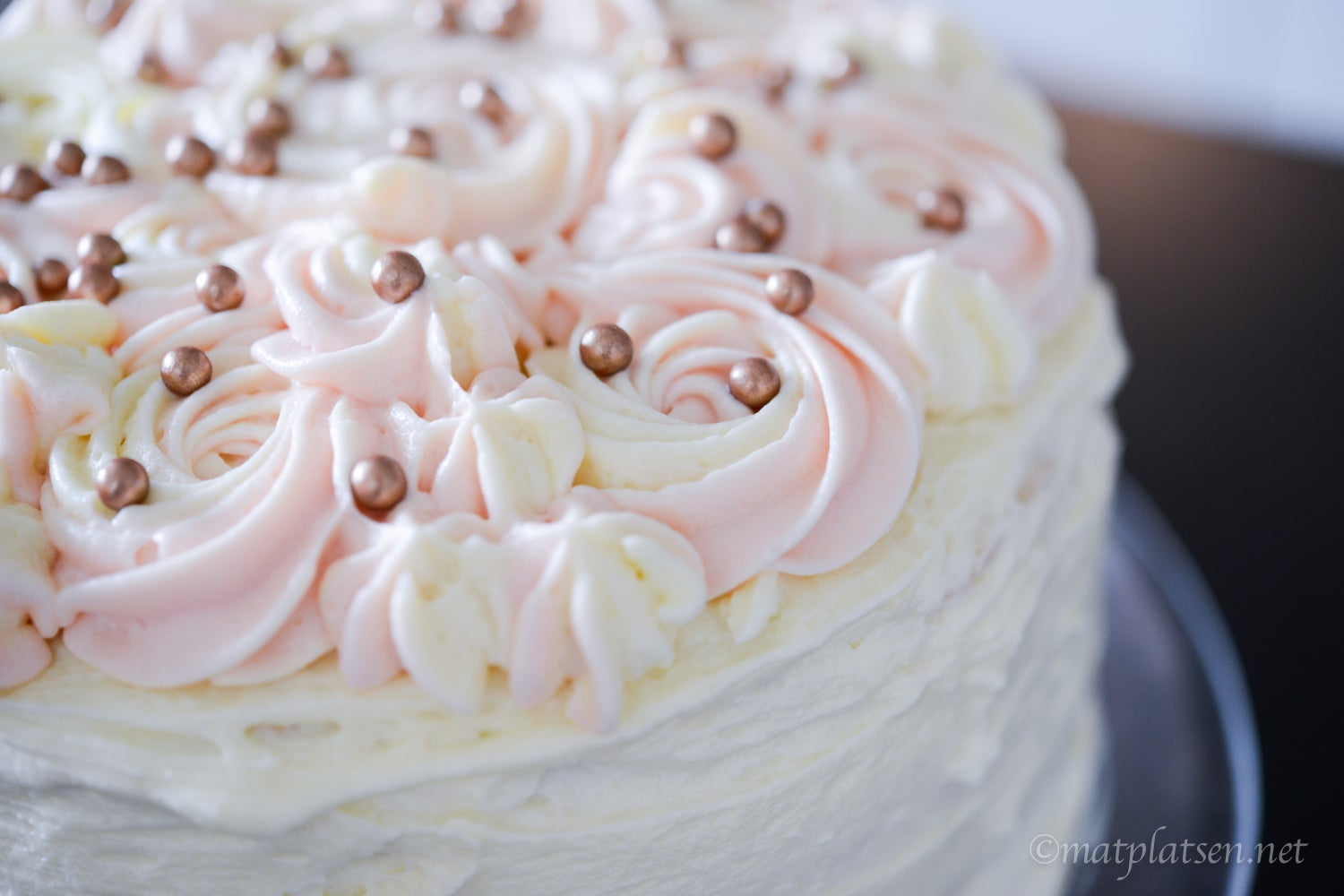 Dela vardera botten till två delar med en lång typ filékniv. Lägg ut en första botten på ett fat. Bred på hälften av hallonmoussen. Lägg på nästa botten. Stryk sedan på passionscurden och lägg på nästa botten. Bred ut resterande hallonmousse och lägg på sista tårtbotten. Täck tårtan med ett jämnt lager utav den gulvita frostingen med en tårtspatel. Fyll en sprits med varannat med rosa och gulvit frosting. Nu är det dags att göra rosorna uppe på tårtan. Spritsa rosor som täcker hela ytan och avsluta med att dekorera med sockerpärlor. Ställ in i kylen så att tårtan hålls kall till servering.