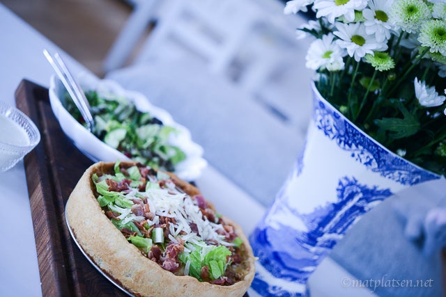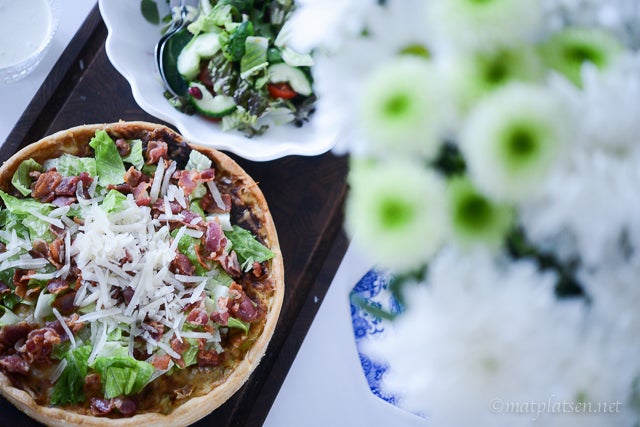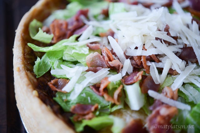Skär bacon i mindre bitar och stek frasiga. Strö dem över pajen tillsammans med strimlad sallad och riven parmesan.