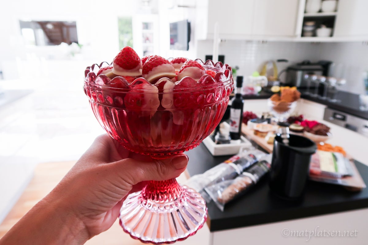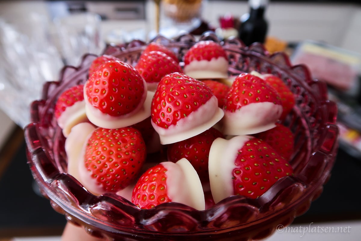 Här har jag doppat dem i vit choklad, lite festligare. Smält vit choklad i vattenbad (micra inte, vit choklad bränns så lätt då) och låt svalna lite. Doppa jordgubbar och lägg på bakpapper i kylen att stelna.