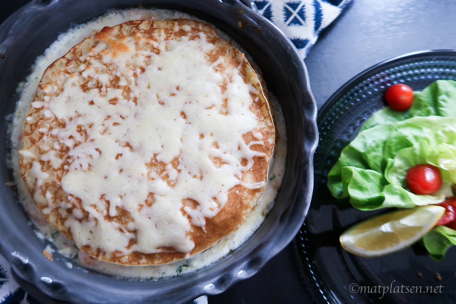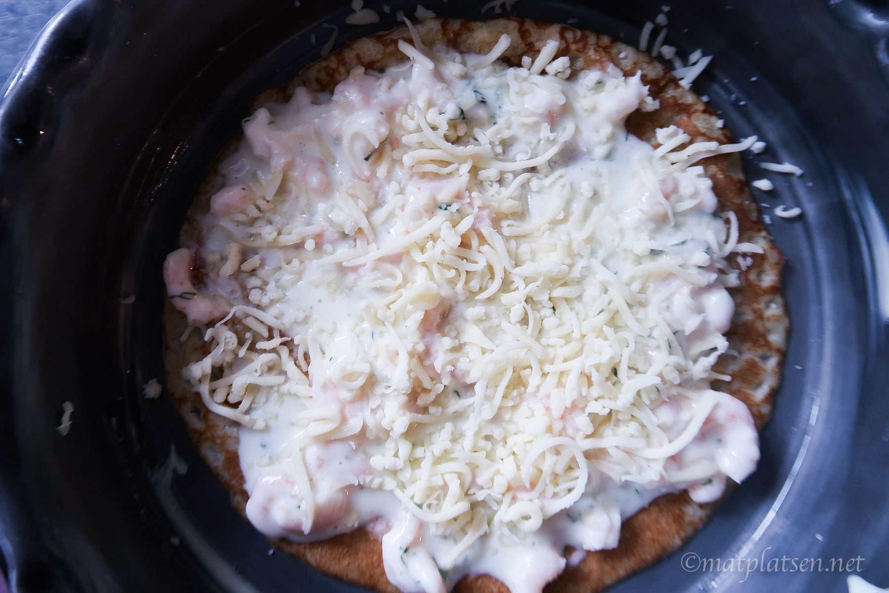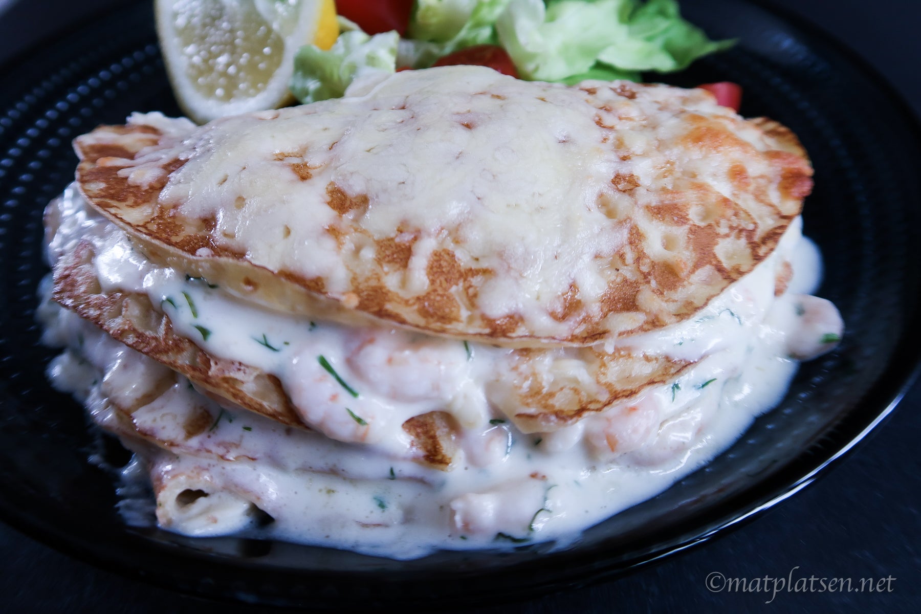 Varva pannkakor med räkstuvning och riven ost, antal lager efter tycke. Min blev ganska stor så den räckte till 2 portioner 🙂 Servera med en god sallad till.