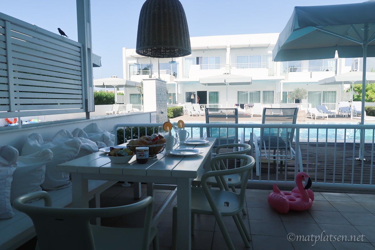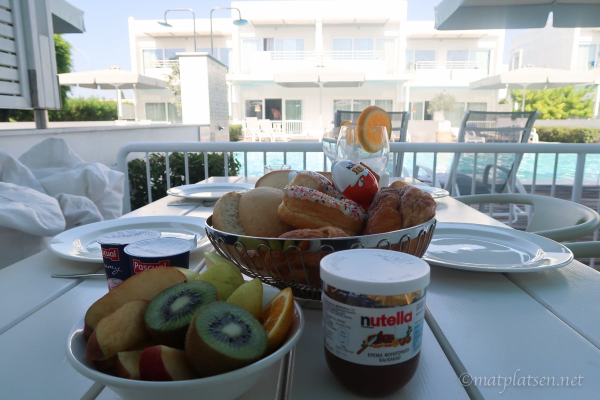Denna gång köpte vi varken all inklusive eller ens frukost på hotellet utan köpte vår egen och åt när vi vaknade på terassen i lugn och ro. Jag vaknade först varje morgon och tog en liten promenad till hotellets minilivs och köpte nybakat bröd och kokade ägg. Så himla skönt! Semester ska ju vara semester och intre stressa efter mattider. Att äta buffe till frukost, lunch och middag och snacks där emellan och passa tider och trängas med halva hotellet om inte mer är inte vår grej har vi märkt med åren. Föredrar att gå ut och äta och se oss omkring istället (går på ungefär samma slutnota)