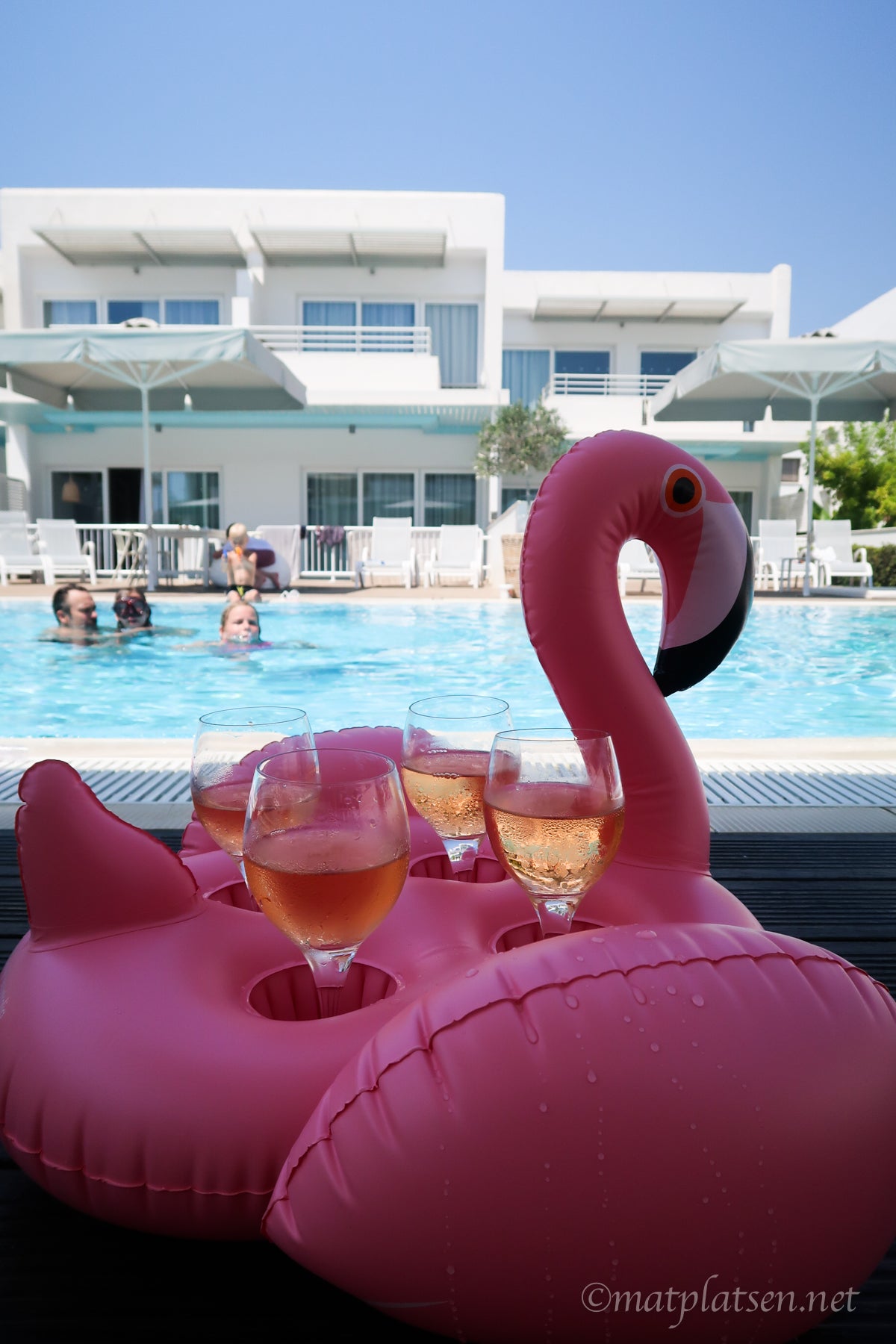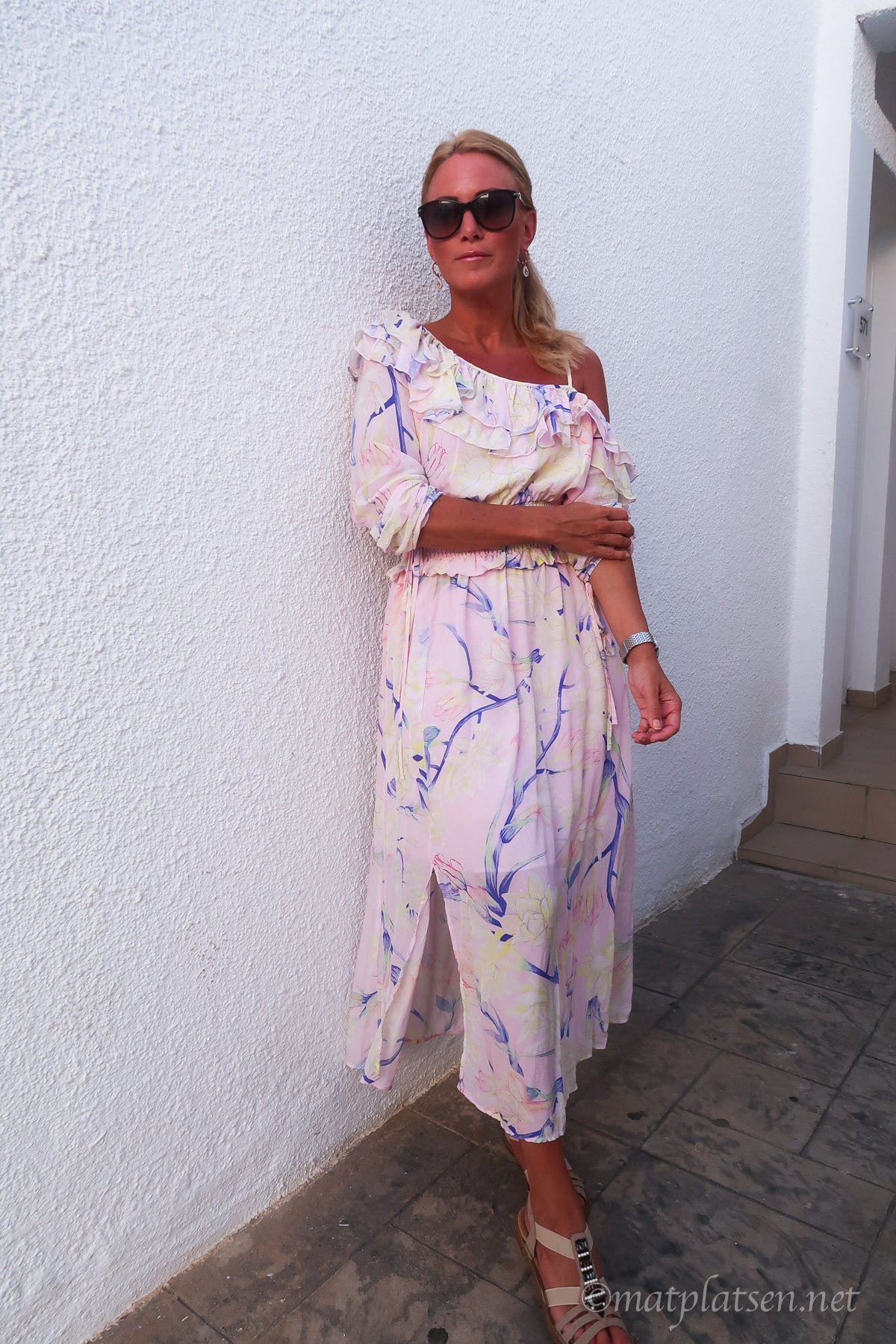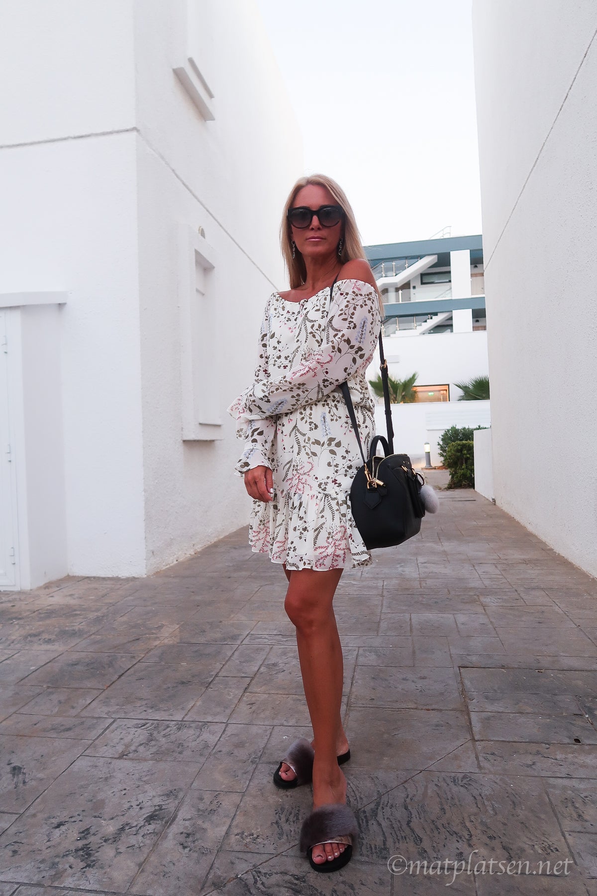 Den utsöta flamingon köpte jag HÄR, ska ha i vårt lilla spabad i vinter 🙂   Vi föredrar poolerna så här men tog oss till stranden en dag (kort promenad från hotellet bara). Jättefint vatten, så där idyll-turkost och så varmt så det kändes inte att man gick i.   Tycker ni hatten ser lustig ut så är det för att Åse satt på den kvällen innan, haha.     Som alltid är det jag går i mest och nästan bara om somrarna sandaler från Rieker. Finns inget skönare! Så alla ni som har en resa inplanerad nu eller i vinter, passa på att förse er med ett par medan de finns i butik (Just dessa heter 62851-60, så himla fina och passar till allt.) Kan gå mil efter mil i dessa. Unnade oss en äkta pinacolada i kokosnöt på beachen, gjord på färskt kokosvatten men det visade sig att jag var allergisk mot det (tydligen en stenfrukt). Men snygg var den 🙂     Åt i princip på samma ställen vi brukar. En del på hotellet men även på Hokkaido, Los Bandidos, Sage, Terazza.. Enda nya (värt att tipsa om) var Roof Burger Bar som vi besökte en kväll.   Första middagen åt vi på Hokkaido, nån blev trött och somnade på stolen <3 Kul med showande kockar och god (och mycket) mat. (Min kvällens var svart klänning H&M och kimono Odd Molly)       (Klänning H&M, sandaler Rieker, solglasögon Missoni – som jag tyvärr tappade bort någonstans buhu) Nästa middag blev Los Bandidos. Det var Cyprioternas lediga vecka när vi var där så det var lite svårt att få bord, fick tag i det sista och hamnade lite i skymundan tyvärr och ljuset var hopplöst att fota mat i men den var god 🙂     Sage är alltid ett säkert kort, har så himla god mat och fin lokal. Dit måste ni gå! (Och barnen bara älskar broocolisoppan man får som en aptitretare).   Min kvällens här var klänning från H&M och Olivias från MOLO Hade lite problem att nå Terazza på telefon för bokning så vi chansade och åkte dit, var själva på restaurangen. Kanske fler som hade problem. Terrazza ägs av svenska Leif och han var där i vanlig ordning och bjöd på drinkar. Trevligt!     Och Roof Burger bar då som sagt, fick tips av en läsare om detta ställe. Lite stressad personal men riktigt riktigt goda hamburgare och vacker utsikt. (Mindre goda drinkar, håll er till vinet. Fick skicka tillbaka Mickes Mojito och min drink smakade surt diskvatten). Små minibrugare till barnen som uppskattades, jag valde en med ägg i (det är ju såå gott i hamburgare) och tryffelmajo. Mums!  (Blev akut sugen på hamburgare nu, det får nog bli middagen i kväll).   Min kvällens var min absoluta favoritklänning i sommar (tänker fin i höst med tights och långkofta) DENNA. Bästa köpet i sommar! Hotellet i all ära, barnen hade jättekul – det finns lekland med pyssel och filmer (och Lollo & Bernie klubben, där var bara Sebbe) datorer och spel, pooler rutschkanor osv..       ..men en dag bokade vi en utflykt med en piratbåt, Black Pearl. Den var borta i 5 timmar om jag minns rätt, det ingick lunch ombord (den var inget vidare) och pirater ordnade lekar för barnen och showade. Vi stannade vid ett par ställen där man fick hoppa av båten ner i det klaraste vatten jag nånsin sett. Såååå mäktigt!     På hotellet är det show nästan varje kväll, det hör till hela semesterkänslan tycker jag, vi satt bänkade varje kväll! Grymt gäng som uppträdde denna gång, ett av de bättre jag hört.     Sebbe var nog den enda som tyckte Lollo & Bernie var spännande detta år, kanske dags att prova något nytt. Åse & jag unnade oss en massage en dag i spa-delen. Då ingick tillträde till deras privata pool en hel dag så vi stannade till där och chillade en stund när resten av gänget gick på ”after beach”. Rofyllt!     Fick så många frågor om mina badtofflor, visst är de söta! Sköna också, använde dem både dag- och kvällstid. Finns HÄR (och i rosa HÄR)   Klänningen är från H&M, väskan Louis Vuitton och solglasögon Twist & Tango.   Nästa år tror jag de rummen vi bodde i kommer tillhöra OBC, den nybyggda lite fräschare och lite lyxigare hotelldelen som ligger bredvid. Vi kikade in och spanade lite snabbt, såg väldigt fint (och vitt) ut.     GRYM semester på alla sätt och vis. Vi åt så gott, hade det så varmt och skönt, bodde toppen och hade det bästa sällskapet. Kom hem så nöjda med sommaren (trots brist på värme här hemma) och fick det perfekta avslutet.     Tack för denna gång Cypern! (Och tack till er som orkade läsa hela detta mastodontlånga inlägg hehe)   KRAM
