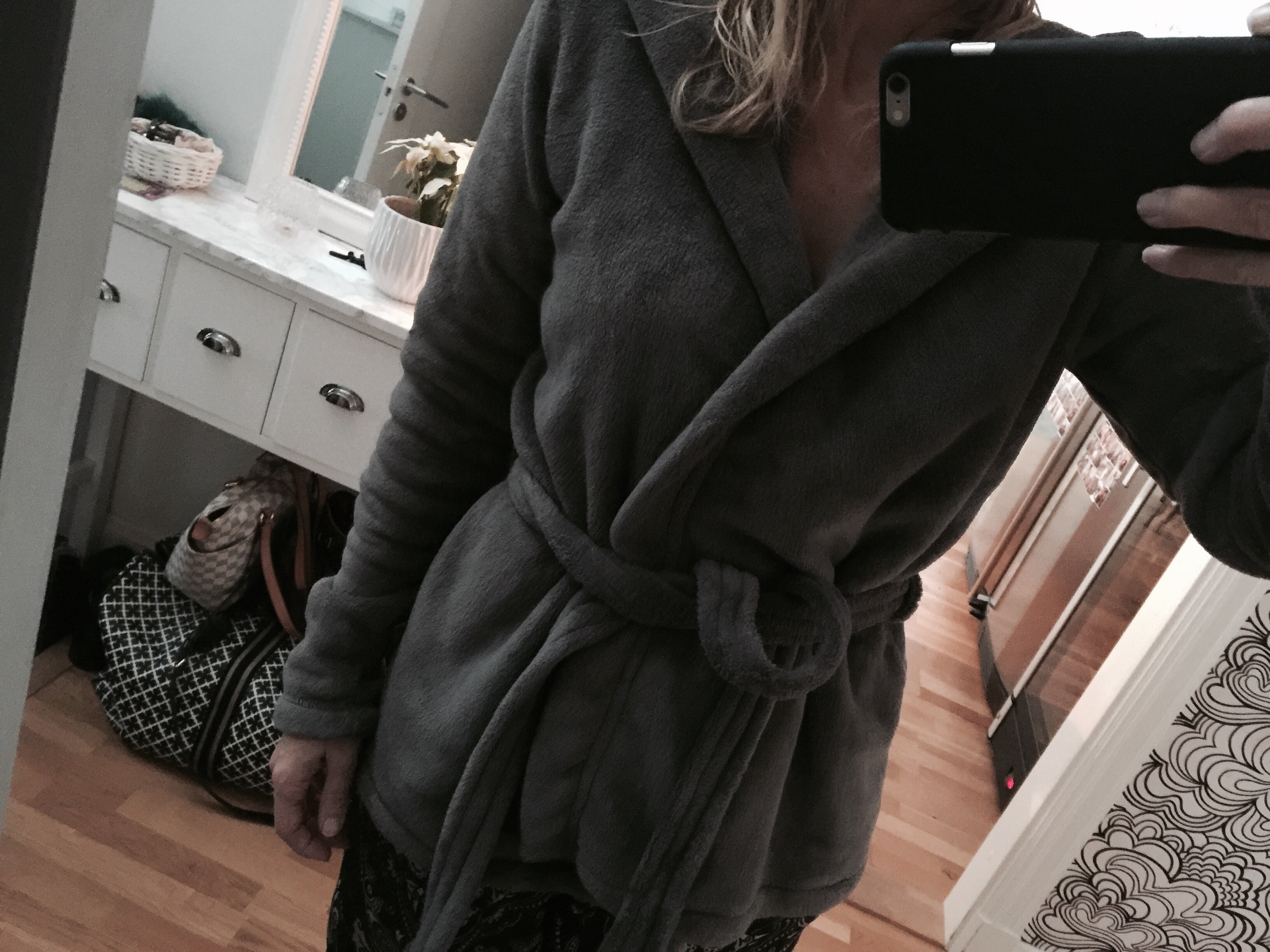 Eftersom jag inte tänker visa mig utanför dörren i dag går jag runt i min absolut fulaste men skönaste tröja. Nån slags blandning mellan kofta, fleece och morgonrock? Ser lika bred ut som lång i den men skönare finns inte! Bilden gör den inte rättvisa hur illa den sitter. Heheh.
