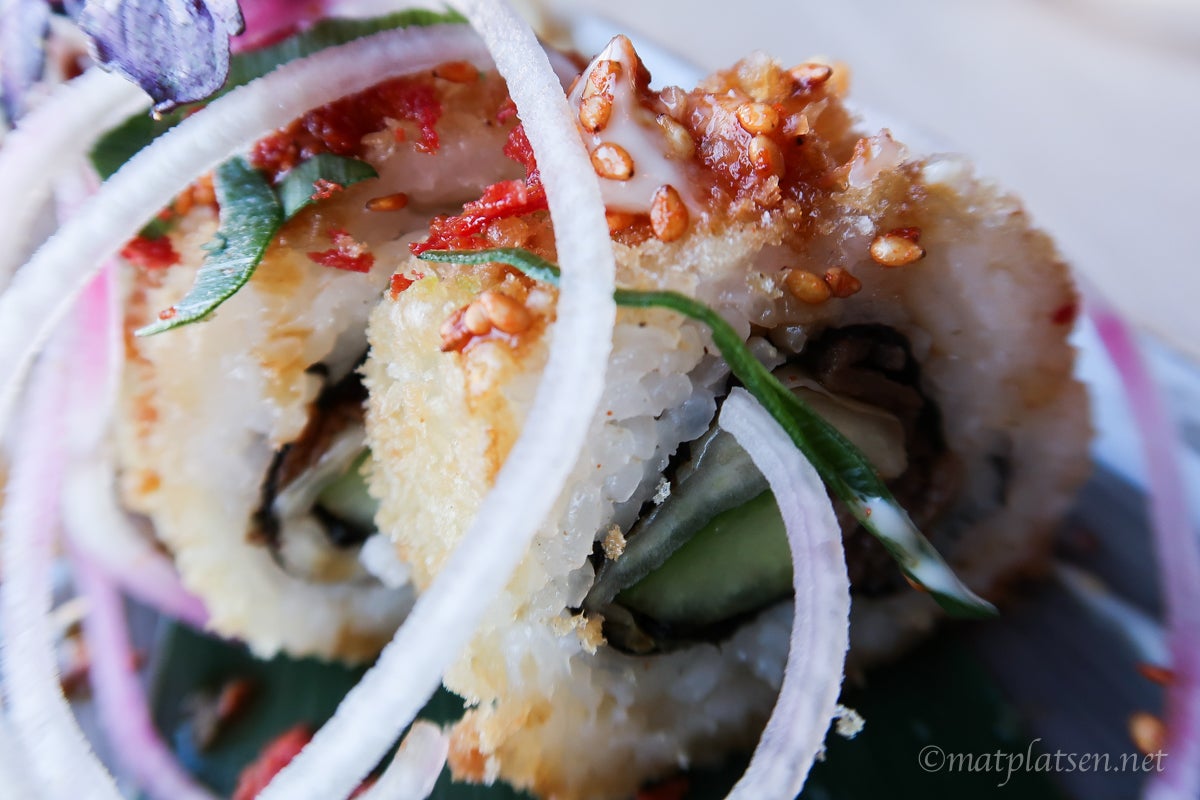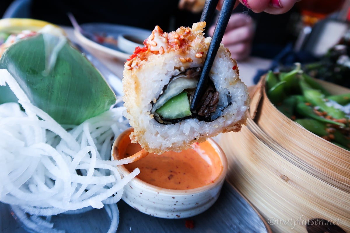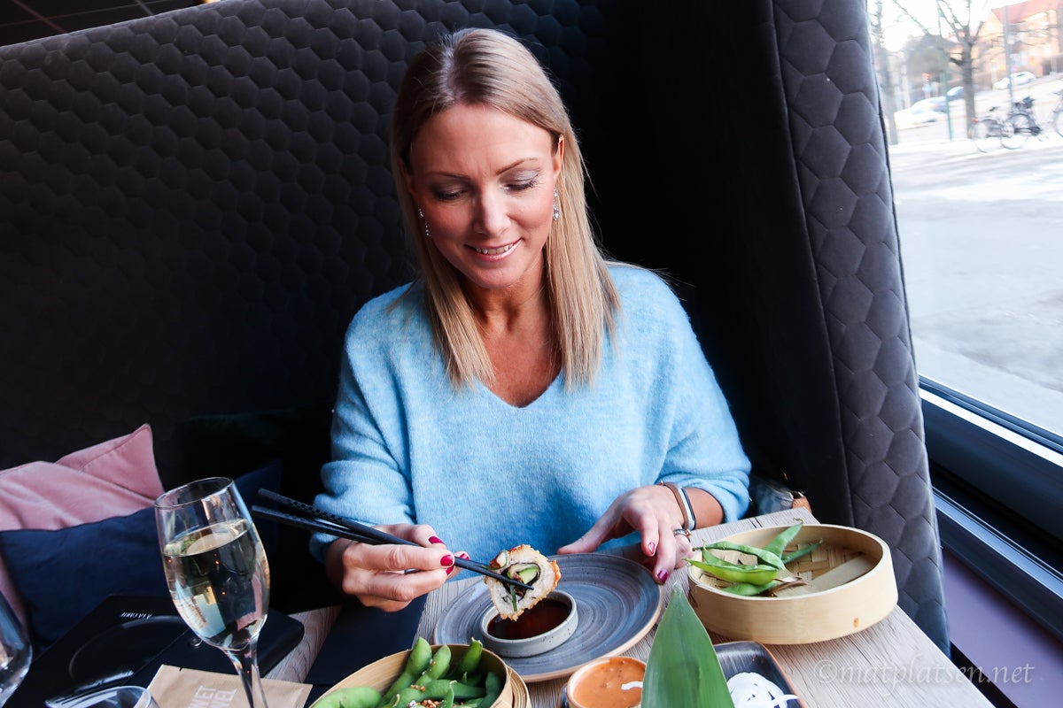 Ni som följt mig ett tag vet kanske vid det här laget att jag i n t e gillar sushi. (inte Micke heller). Kan inte med rå fisk. Men vi fick provsmaka en variant utan fisk, närmare bestämt sushi rullad i pank och friterad med fyllning av entrecote. Nån chilimajo till förutom klassiska sushitillbehör och vet ni? Det var SÅÅÅÅÅ GOTT!!