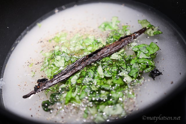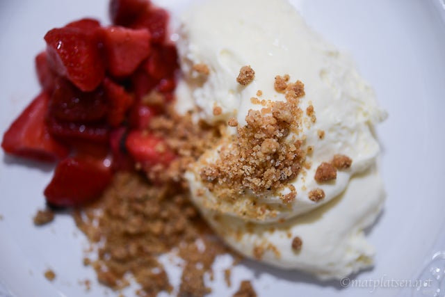 Sist ut på middagen var en favorit. Vit chokladmousse med basilikamarinerade jordgubbar och kardemummaströssel. Chokladkrämen kokas till kvällen innan och likaså kardemummaströsslet och lagen kan man förbereda då.