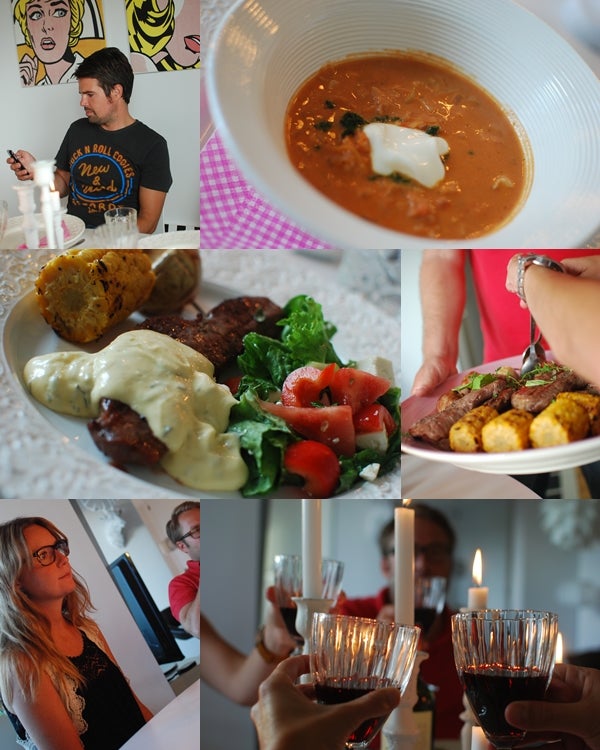 Lite seg bloggerska här i dag faktiskt 🙂 Var på så trevlig middag i går hos goda vännerna Marcus & Emelie och åt och drack gott. De var gulliga och hade gjort lchf-vänlig meny (förutom desserten då, men en liten bit slank ner 😉 ) Till förrätt var det mustig god fisksoppa, till huvudrätt grillad biff med majskolv, baconrullade champinjoner, sallad & vitlöksbearnaise och till dessert vildhallonpaj med vitchoklad och vaniljglass.