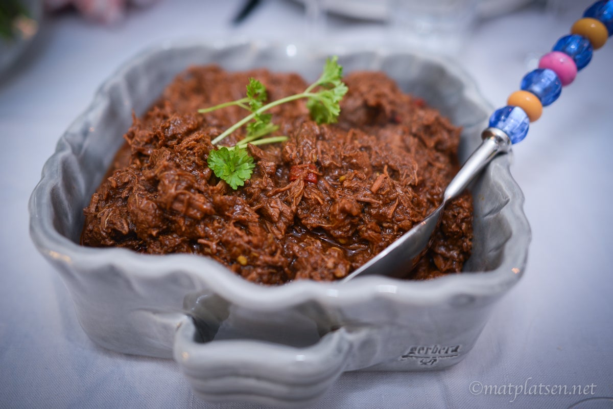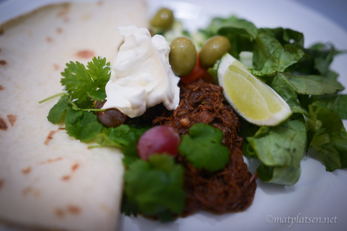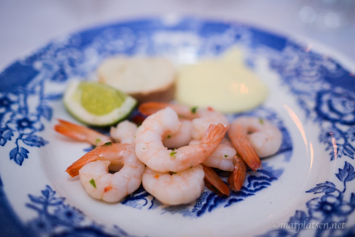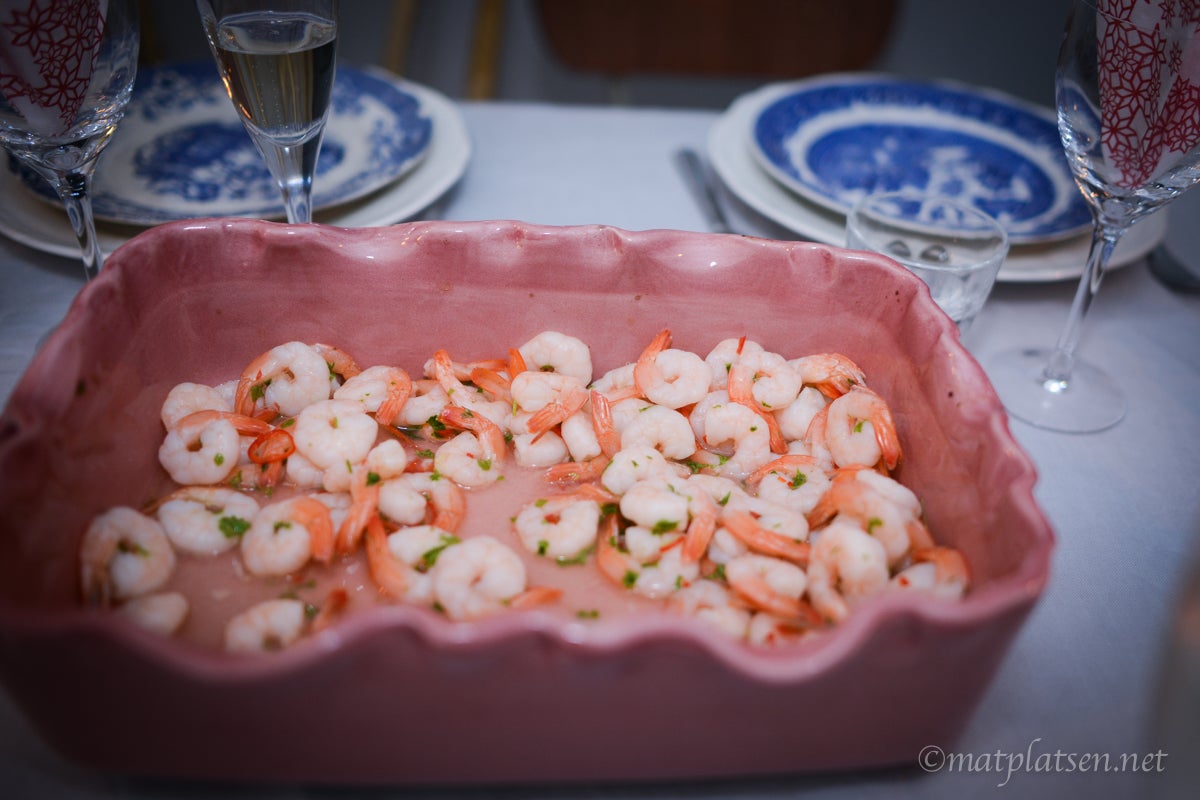 Till förrätt fick vi marinerade räkor med aioli och baguetter och till huvudrätt en kryddig chilli med tillbehör. Gott!