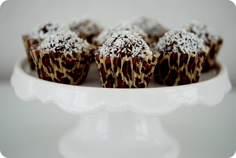 Blanda allt utom kokos till en smet (jag använder matberedare alt kitchenaiden så det blir riktigt mosat och blandat). Forma bollar och rulla i kokos. Lägg dessa i formar och ställ kallt en stund.