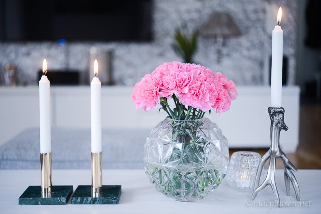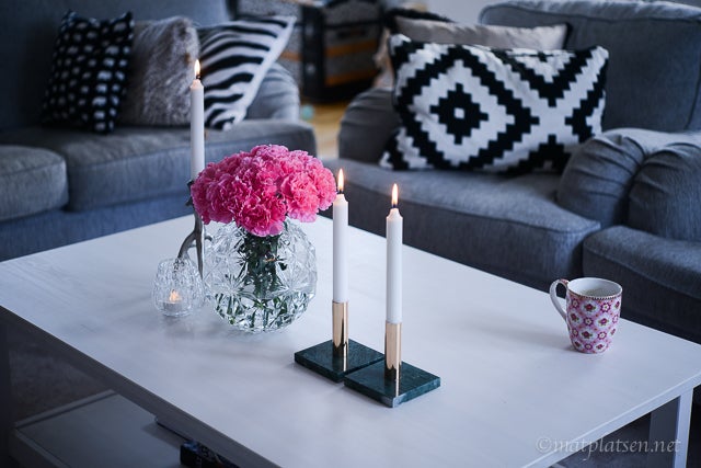Får många frågor om de här grejerna som just nu står på vardagsrumsbordet (bordet är för övrigt från Ikea). Vasen är från hemtex, gren-ljsustaken H&M, ljuslyktan kotten från Svenskt tenn, de gröna marmorljusstakarna med mässing Ellos och kaffekoppen från Pip Studio. De knallrosa blommorna hittade jag på Ica Maxi 🙂